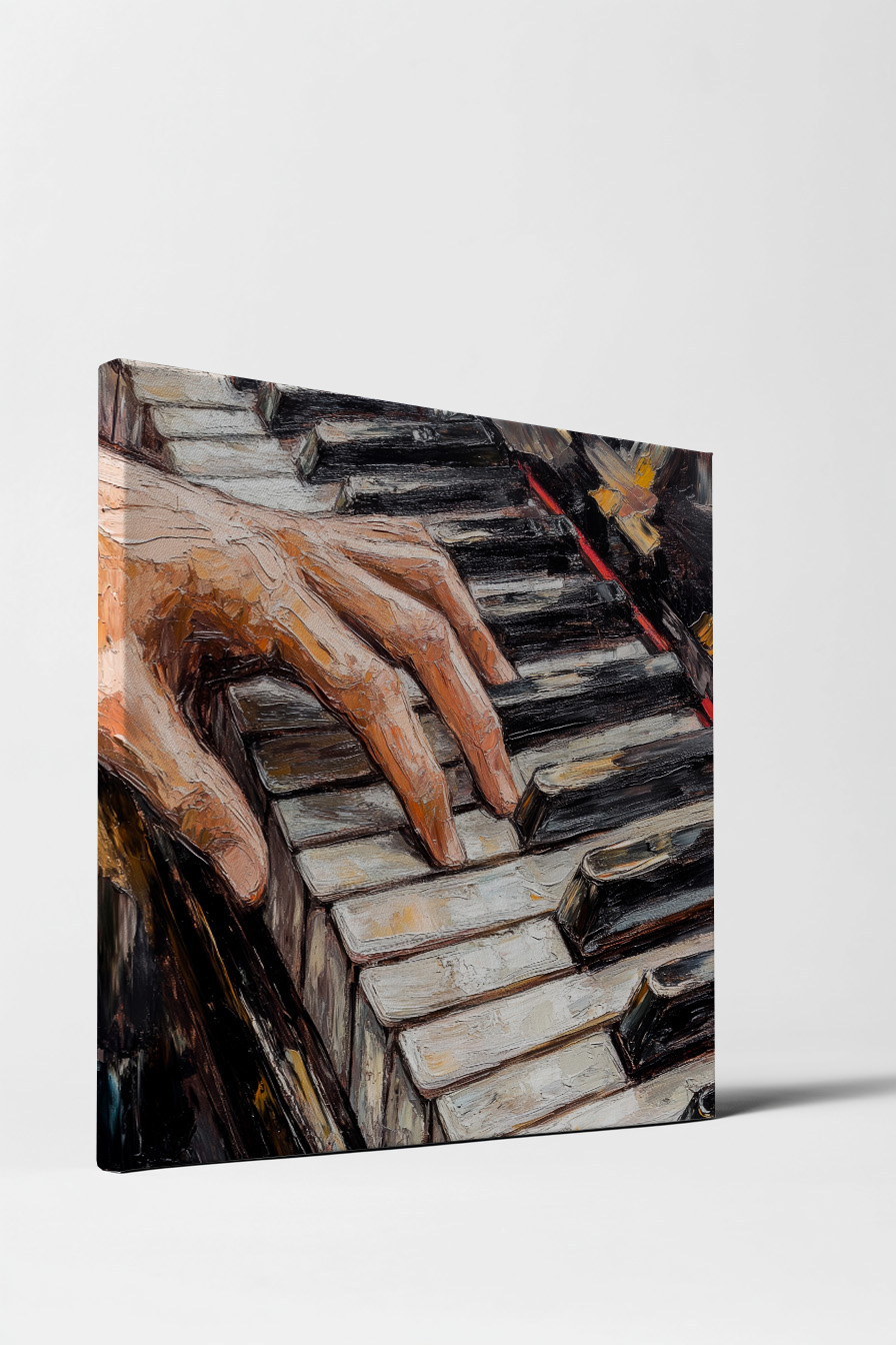 Ein dynamisches Zusammenspiel von Händen und Klaviertasten erzeugt eine kraftvolle und musikalische Atmosphäre. Die texturierte Oberfläche lässt den Moment des Spiels spürbar werden und legt den Fokus auf das Zusammenspiel von Mensch und Instrument.