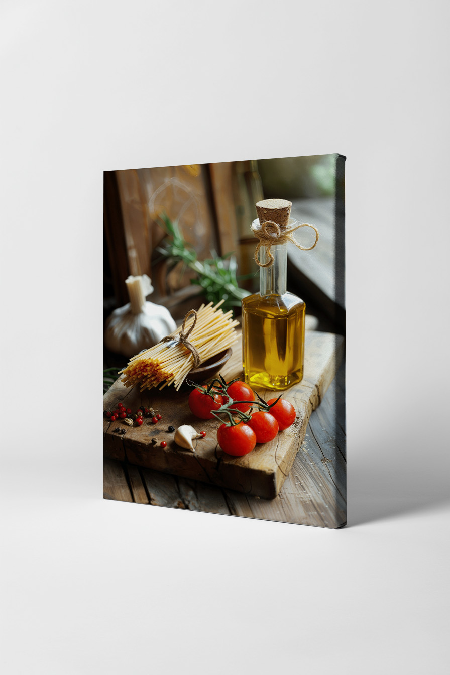 Großflächige Holzplatten geben Tiefe, die Tomaten wirken fast greifbar rot und saftig. Die Glasflasche mit Kork und Schleife nimmt das natürliche Licht auf, während die Spaghetti lose gruppiert sind. Alles wirkt arrangiert und doch lebendig, eine stille Einladung in eine warme Küche.