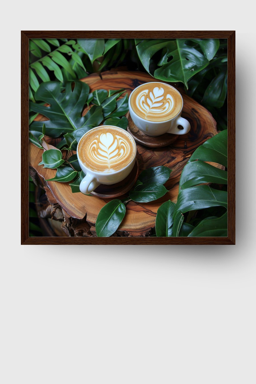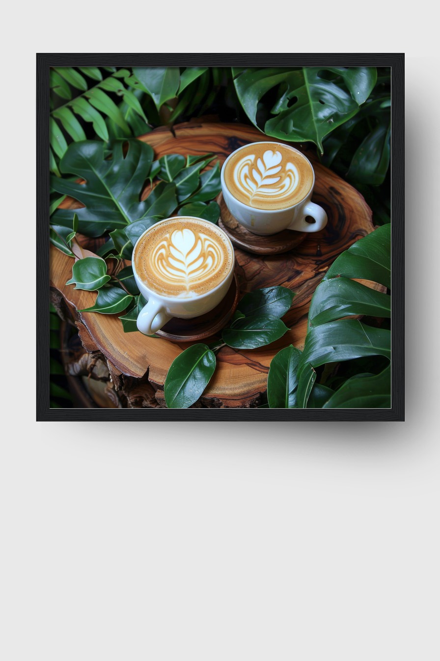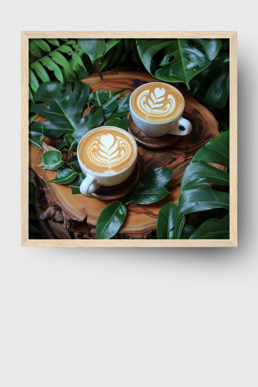 Latte-Tassen auf rustikalem Holz. Blattgrün sorgt für frischen Kontrast. Klare Formen und Farben prägen das Bild.