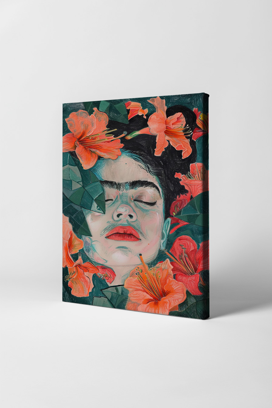 Frauenporträt mit Lilien auf Baumwoll-Polyester-Leinwand (300-350 g/m²) gespannt auf FSC-Kiefernholzrahmen. Inklusive Aufhängeset, fertig zum Hängen.