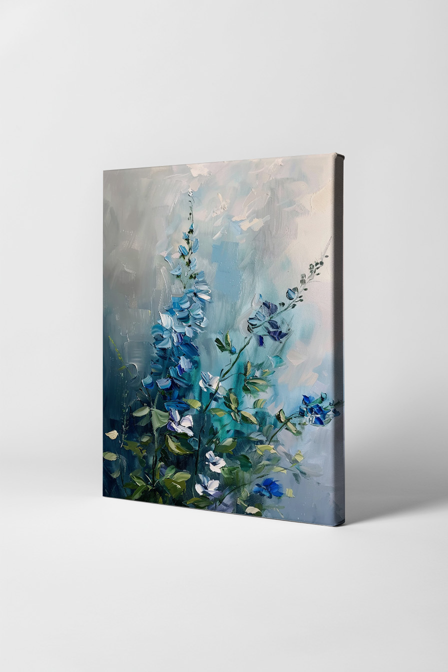 Mehrere blaue Wickenzweige ragen schräg nach oben. Lockerer, abstrakter Hintergrund in Blau und Grau.