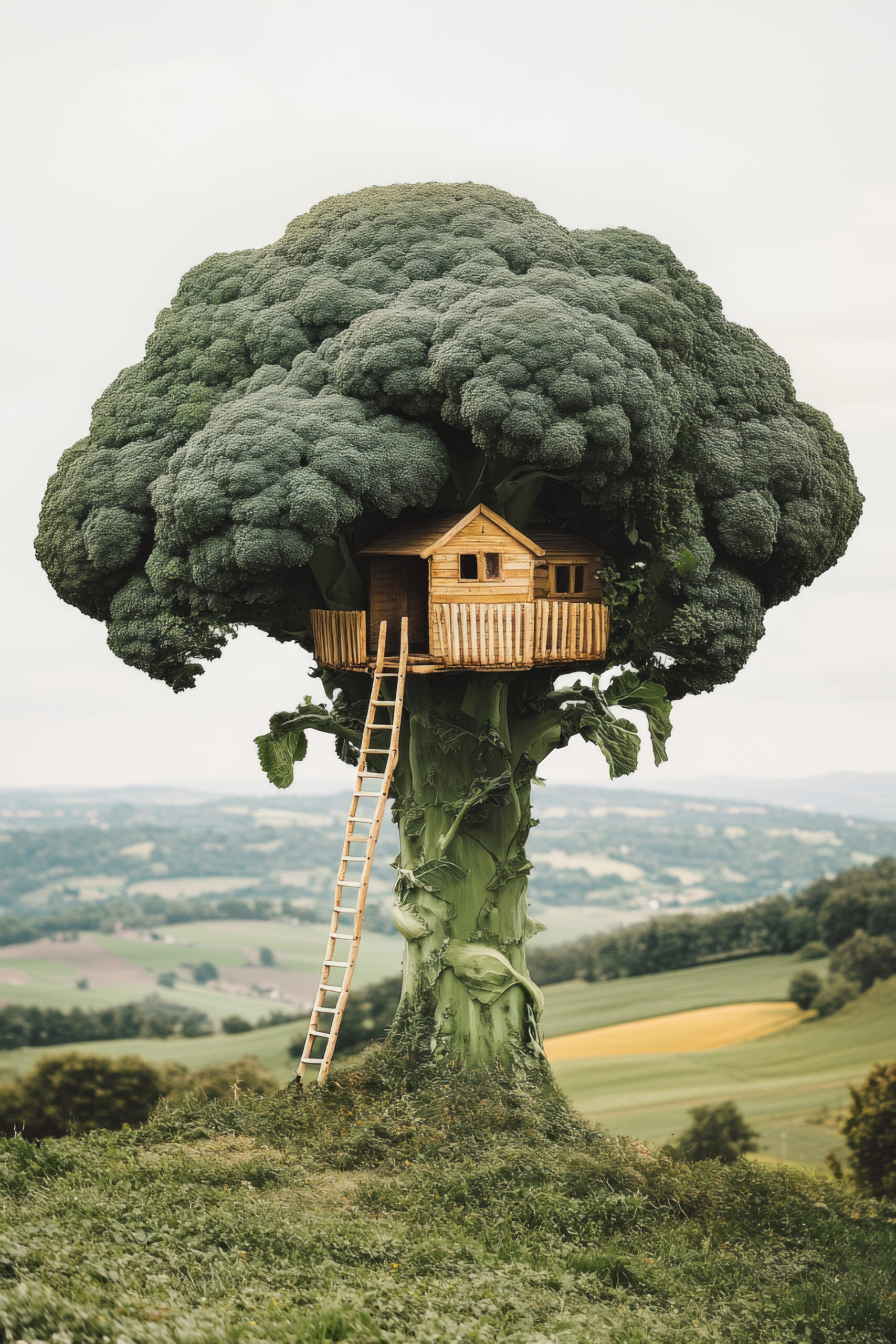 Ein Baumhaus, das aus einem Brokkoli geformt ist, steht in einer weiten Landschaft. Die natürliche Kombination aus Gemüse und Architektur schafft eine humorvolle und kreative Szene.