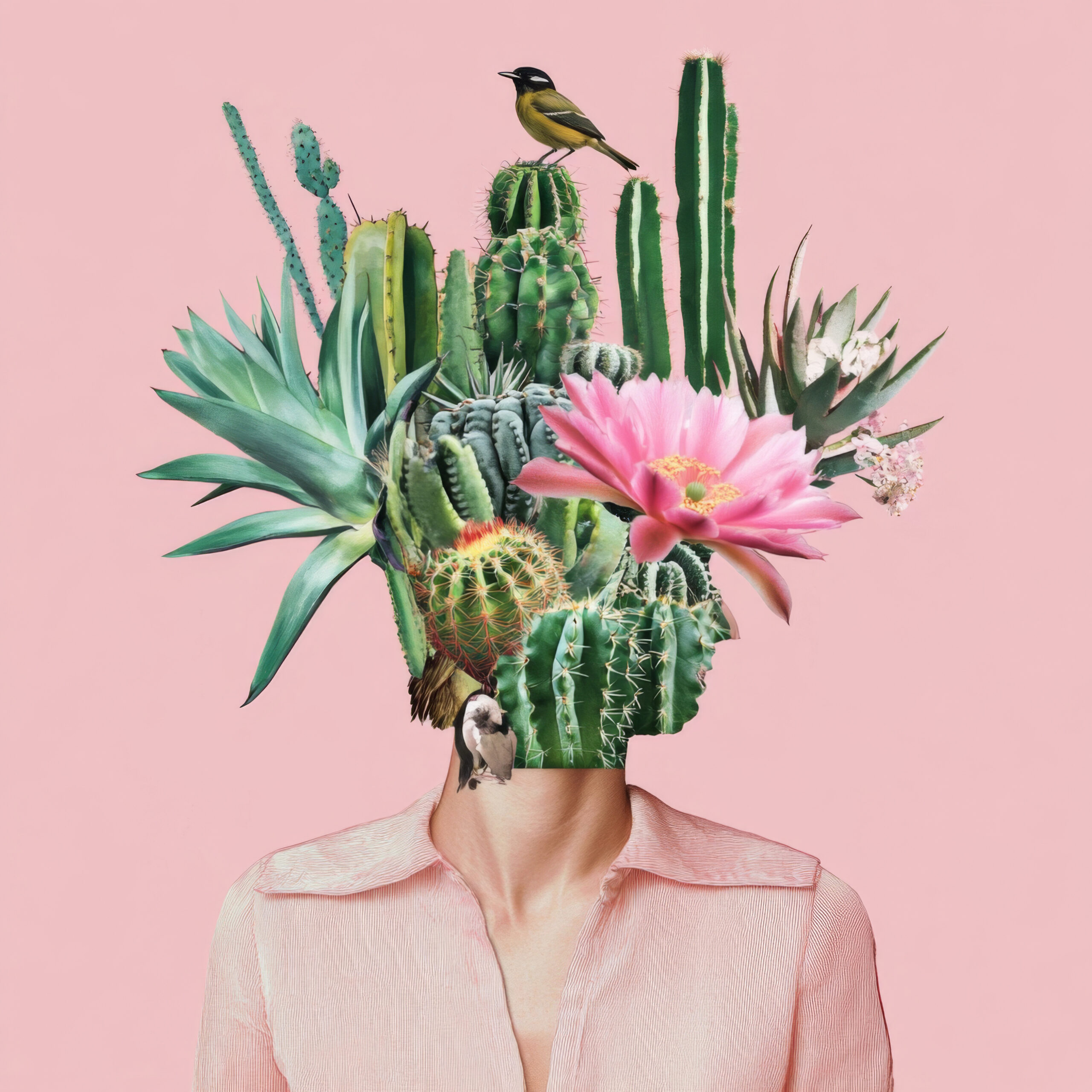 Das Bild zeigt eine surrealistische Darstellung mit einem Kopf aus Kakteen und Sukkulenten. Eine pinke Blüte und kleine Vögel setzen lebendige Akzente vor dem einfarbigen Hintergrund.