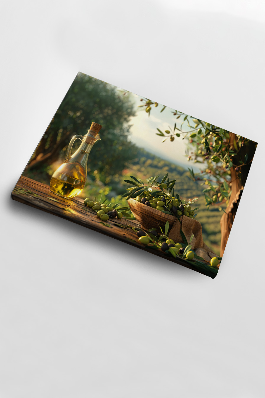 Auf dem hölzernen Tisch liegen grüne und dunkle Oliven verstreut, neben ihnen ruht die Flasche mit goldenem Öl. Die natürliche Textur von Holz und Stoff umrahmt das Arrangement, das von einem sanften Licht durchwebt ist.