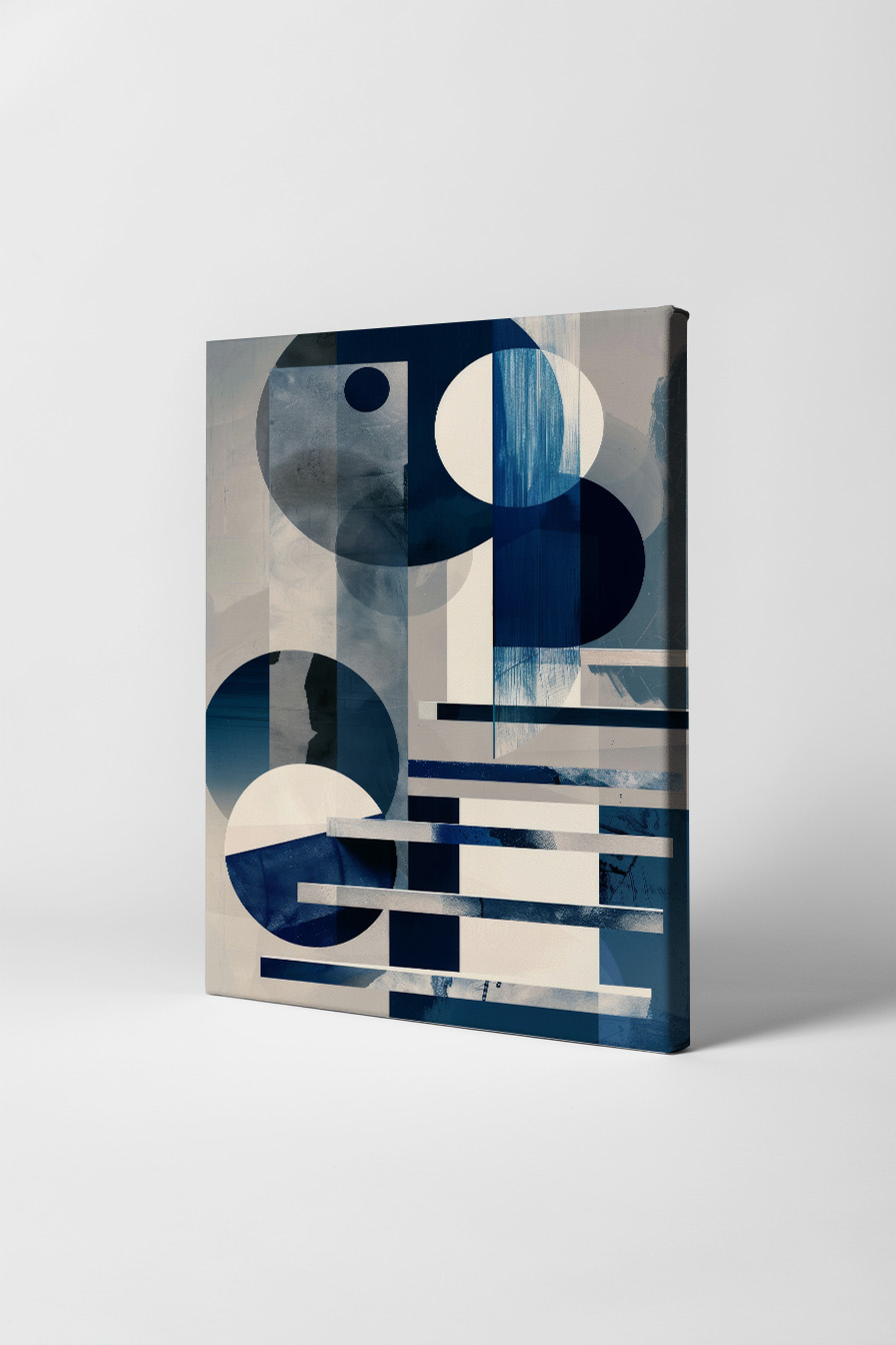 Das Zusammenspiel von geometrischen Kreisen und linearen Streifen erzeugt eine architektonisch-sachliche Atmosphäre. Die ausgewogene Balance harmonischer Blautöne mit Weiß vermittelt eine kühle, strukturierte Dynamik.