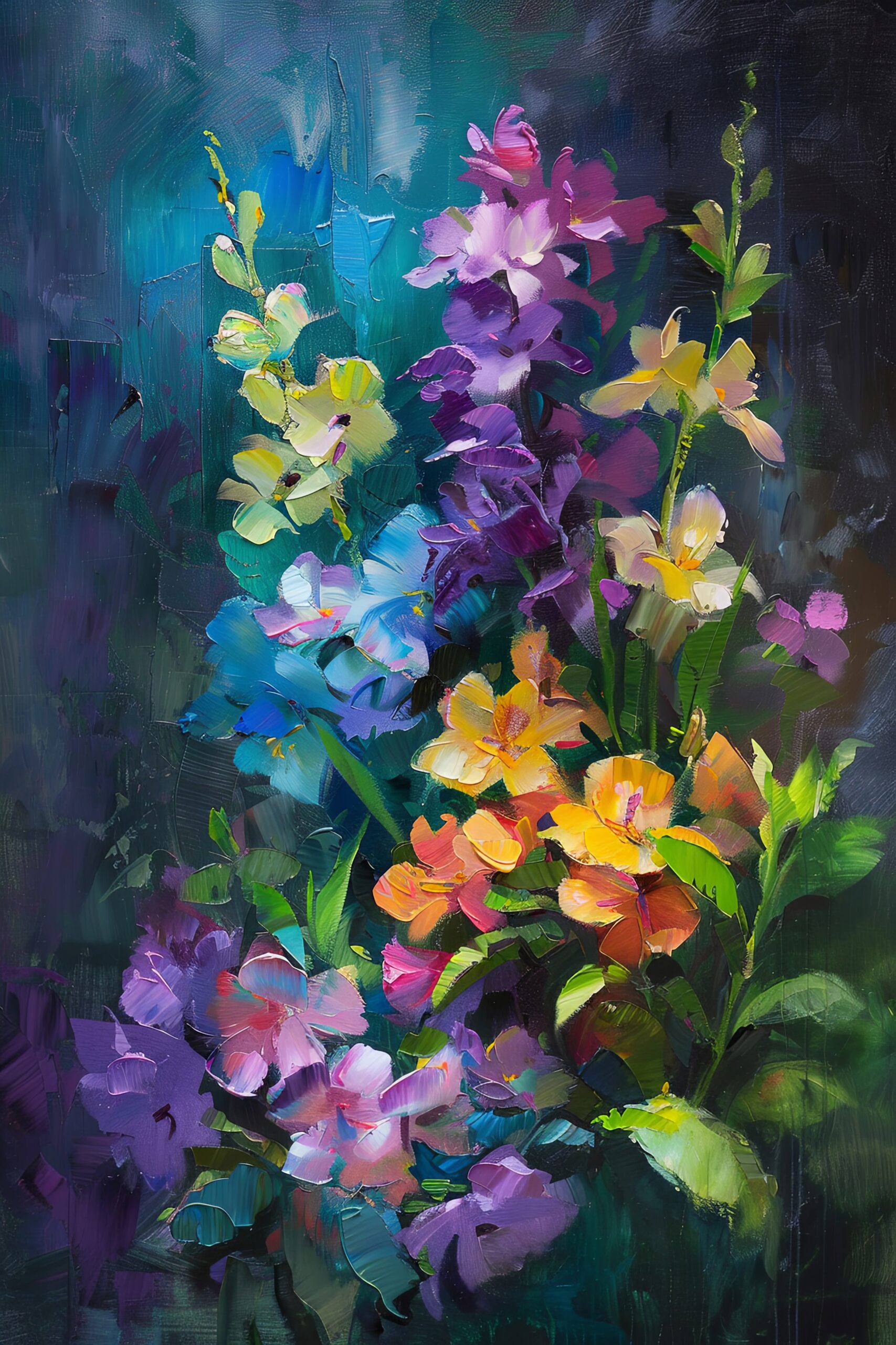 Das Arrangement wirkt lebendig und zugleich harmonisch, als seien die Blüten in einem tänzerischen Wechselspiel aus Licht und Schatten eingefangen. Die Kombination kräftiger Farben und expressiver Pinselschwünge verleiht dem Strauß seine charaktervolle Präsenz.