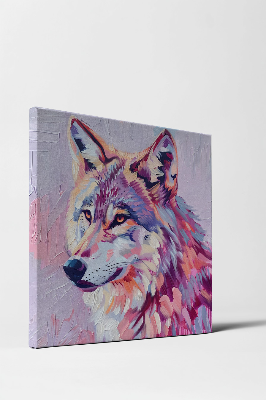 Farbenreicher Wolf auf Baumwoll-Polyester-Leinwand (300-350 g/m²) gespannt auf FSC-zertifiziertem Kiefernholzkeilrahmen. Der Tiefeneffekt der Pinselstriche bleibt sichtbar. Inklusive Aufhängeset, fertig zum Aufhängen.