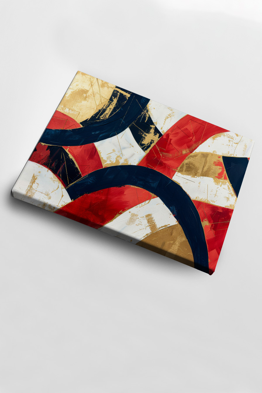 Dynamisches Zusammenspiel von Farben. Rote und blaue Bögen treffen auf goldene und weiße Flächen. Komposition lebt durch Schichtung.