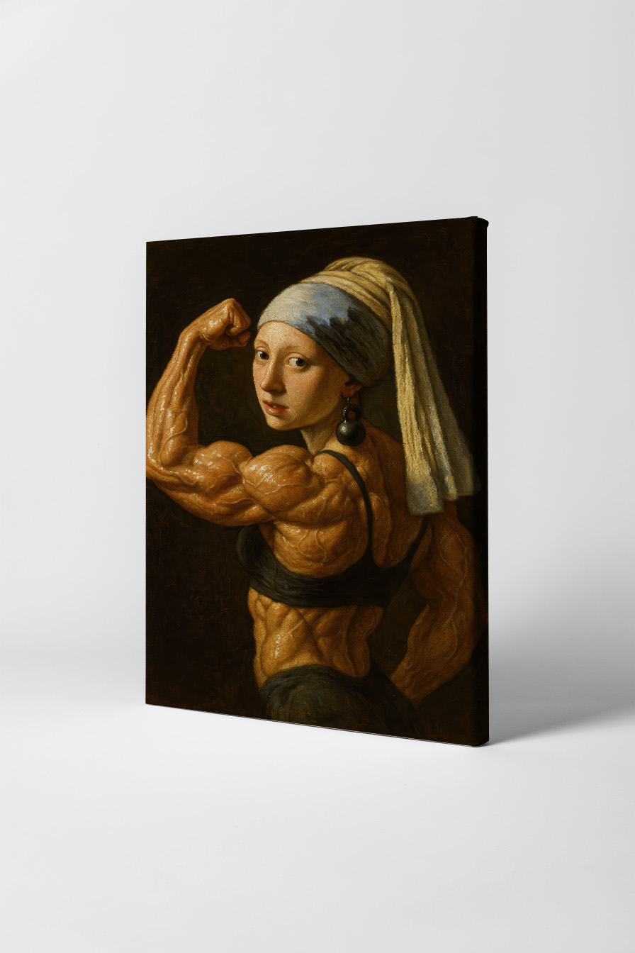 Das Bild zeigt ein Mädchen mit stark betonten Muskeln. Auf Baumwoll-Polyester-Leinwand (300-350 g/m²) gespannt auf FSC-zertifiziertem Kiefernholzrahmen. Inklusive Aufhängeset, fertig zum Aufhängen.