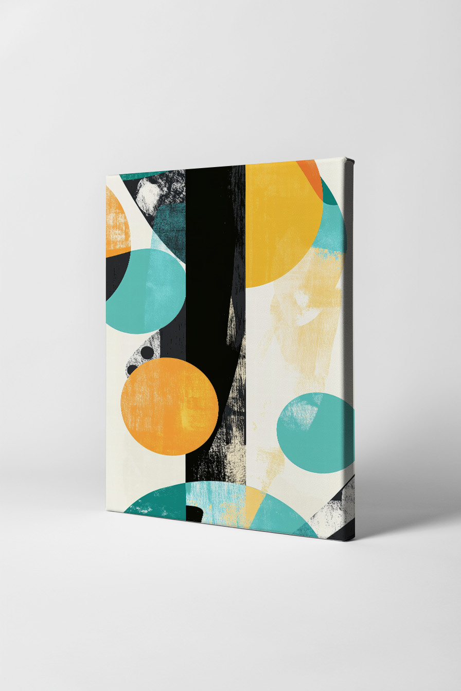 Dieses Motiv zeigt abstrakte Kreise in Orange und Türkis mit einem schwarzen senkrechten Balken. Die Farben sind kräftig und die Formen klar definiert.