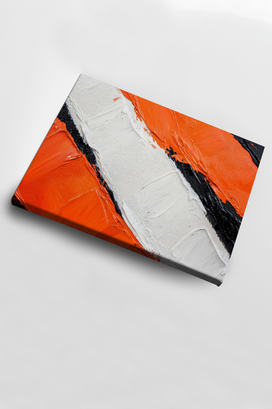 Die Farbstreifen in Orange, Weiß und Schwarz sind auf Baumwoll-Polyester-Leinwand (300-350 g/m²) gespannt. Der Keilrahmen aus FSC-zertifiziertem Kiefernholz ist 2 cm tief. Mit Aufhängeset, fertig zum Platzieren.