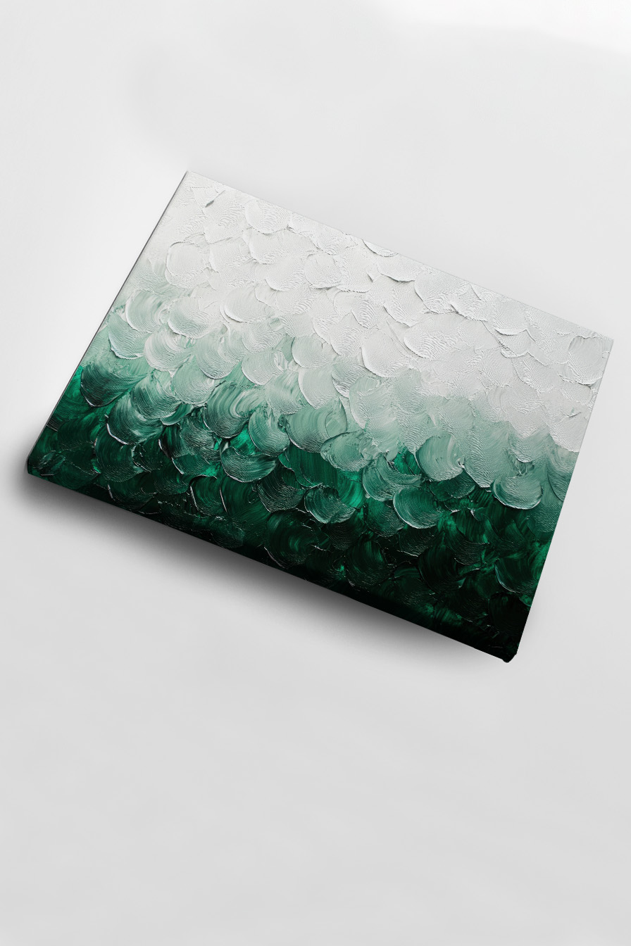 Farbstruktur in Grün und Weiß auf Baumwoll-Leinwand (300-350 g/m²) aufgespannt. Die Struktur der Farbe bleibt sichtbar und gibt dem Bild Tiefe. Inklusive Aufhängeset, bereit zum Aufhängen.