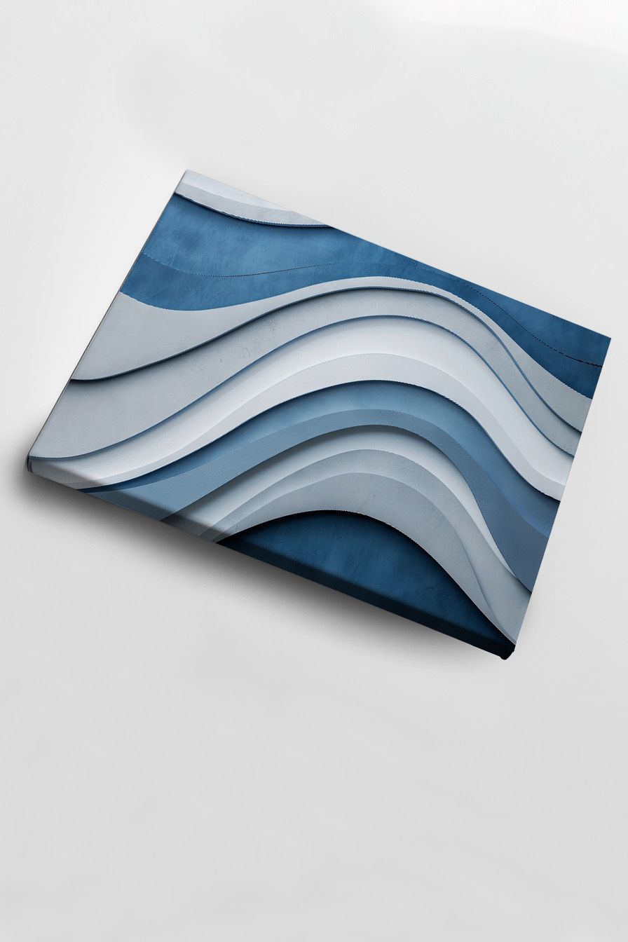 Dieses Motiv zeigt abstrakte, wellenförmige Flächen in Blau- und Weißtönen. Die klare Struktur bringt Ruhe und Dynamik in jeden Raum.