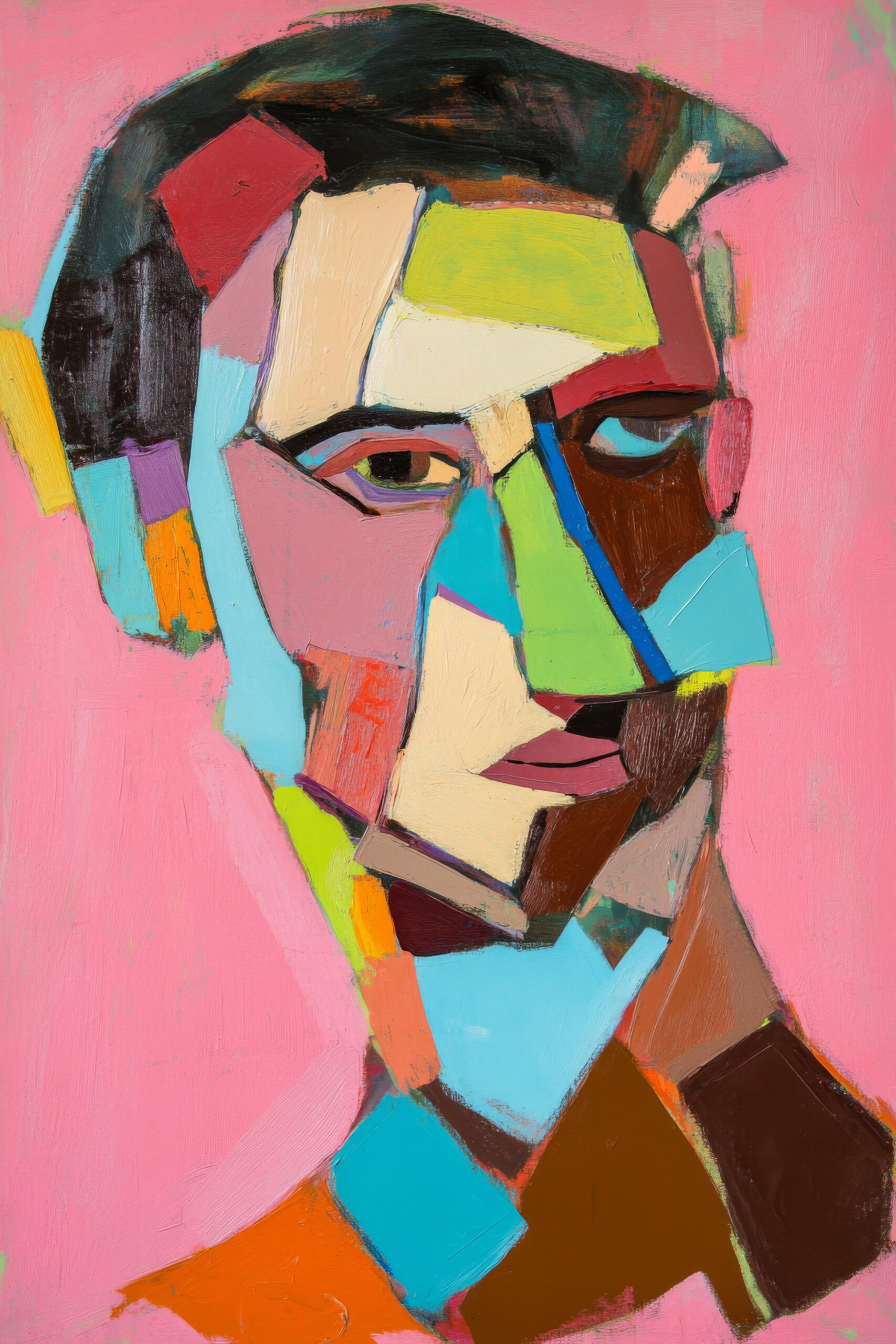 Kubistisches Poster mit farbenfrohem abstraktem Männergesicht in kräftigen Tönen vor rosa Hintergrund, moderner Kunstdruck