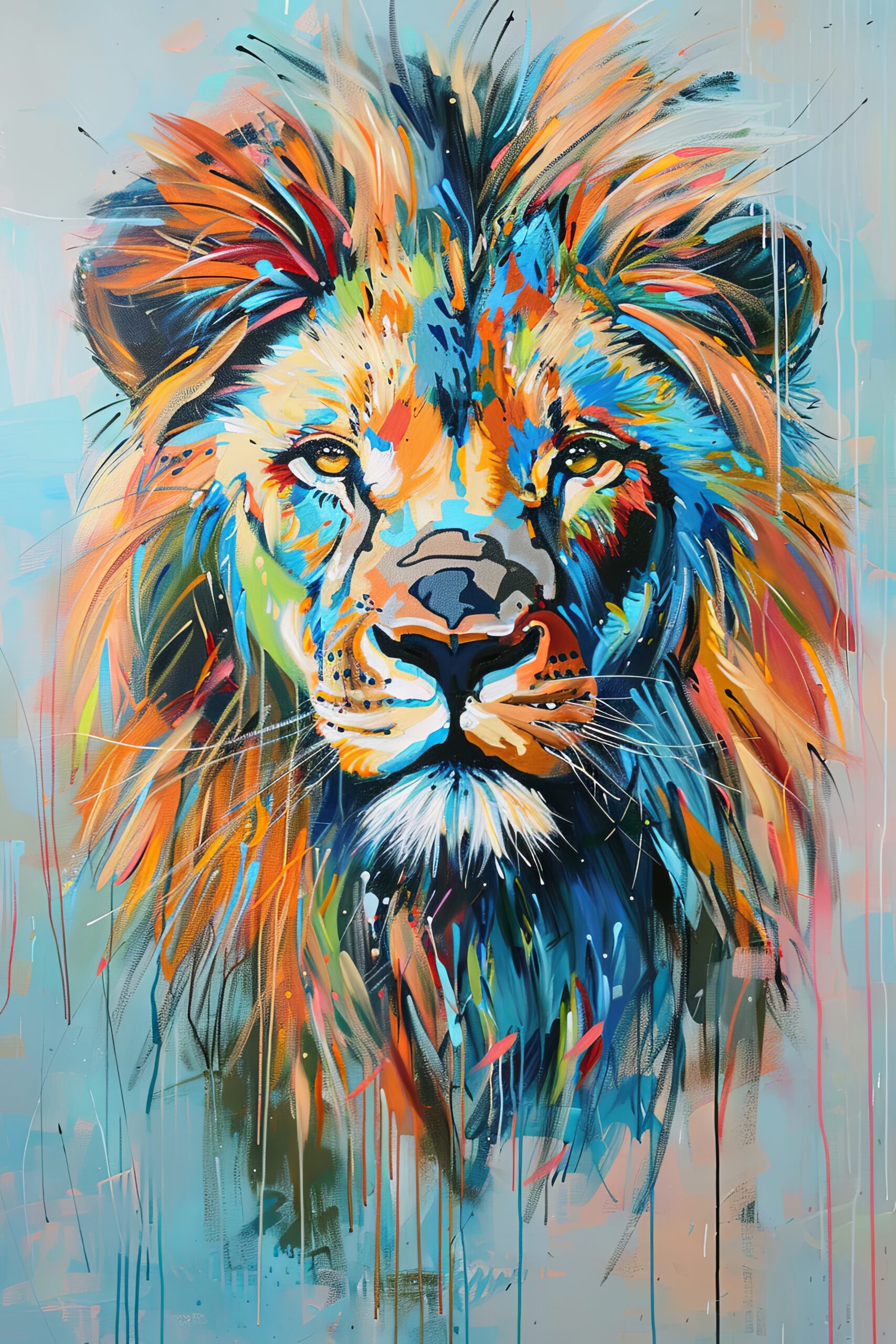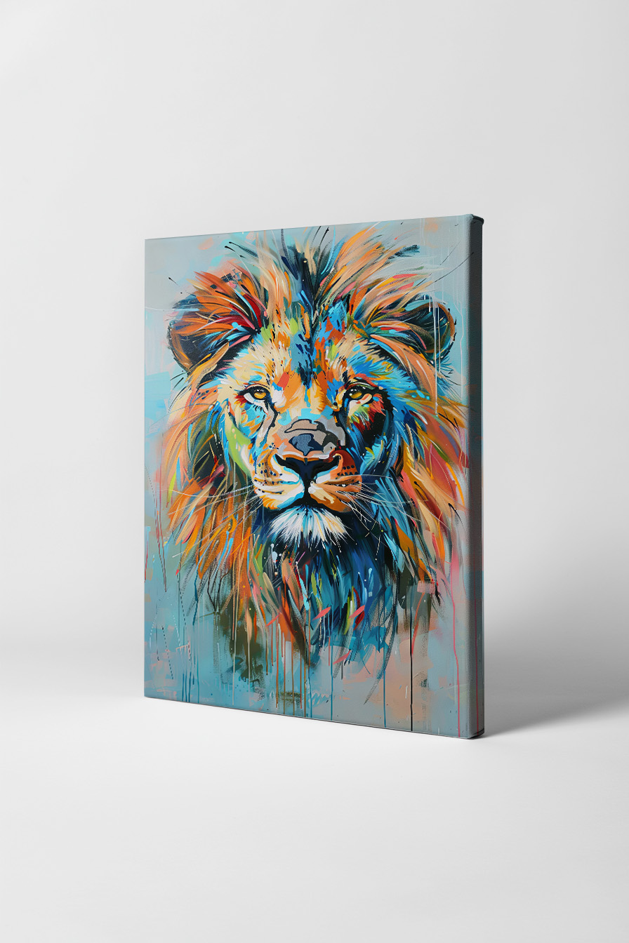 Eine farbige Löwendarstellung auf Baumwoll-Polyester-Leinwand gespannt. Die strukturierte Oberfläche unterstreicht die Dynamik des Motivs. Fertig zum Aufhängen.