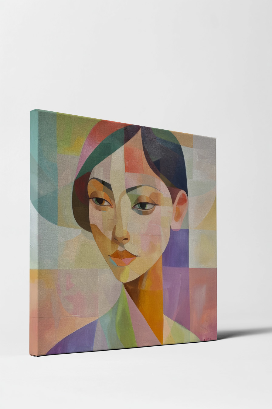Das gesamte Bild wirkt wie ein harmonisches Puzzle aus Farben und Formen, das klassische Porträt und abstrakte Kunst verbindet. Die ruhige Mimik schafft eine besondere Atmosphäre.