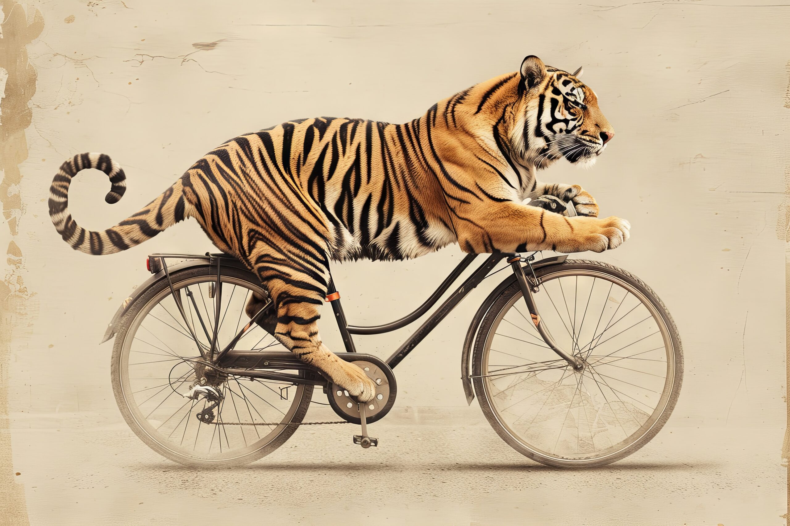 Die ungewöhnliche Szene mit einem Tiger, der auf einem Fahrrad balanciert, erzeugt einen spannungsgeladenen Kontrast zwischen natürlicher Kraft und zivilisatorischem Objekt.