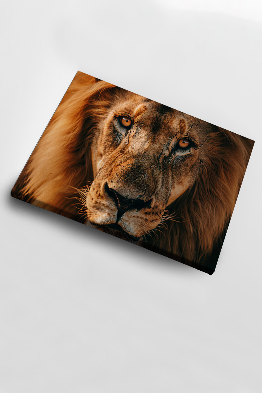 Der Löwe tritt stark und präsent hervor, gefasst auf Baumwoll-Leinwand (300-350 g/m²) gespannt auf FSC-Keilrahmen. Inklusive Aufhängeset, bereit zum Hängen.