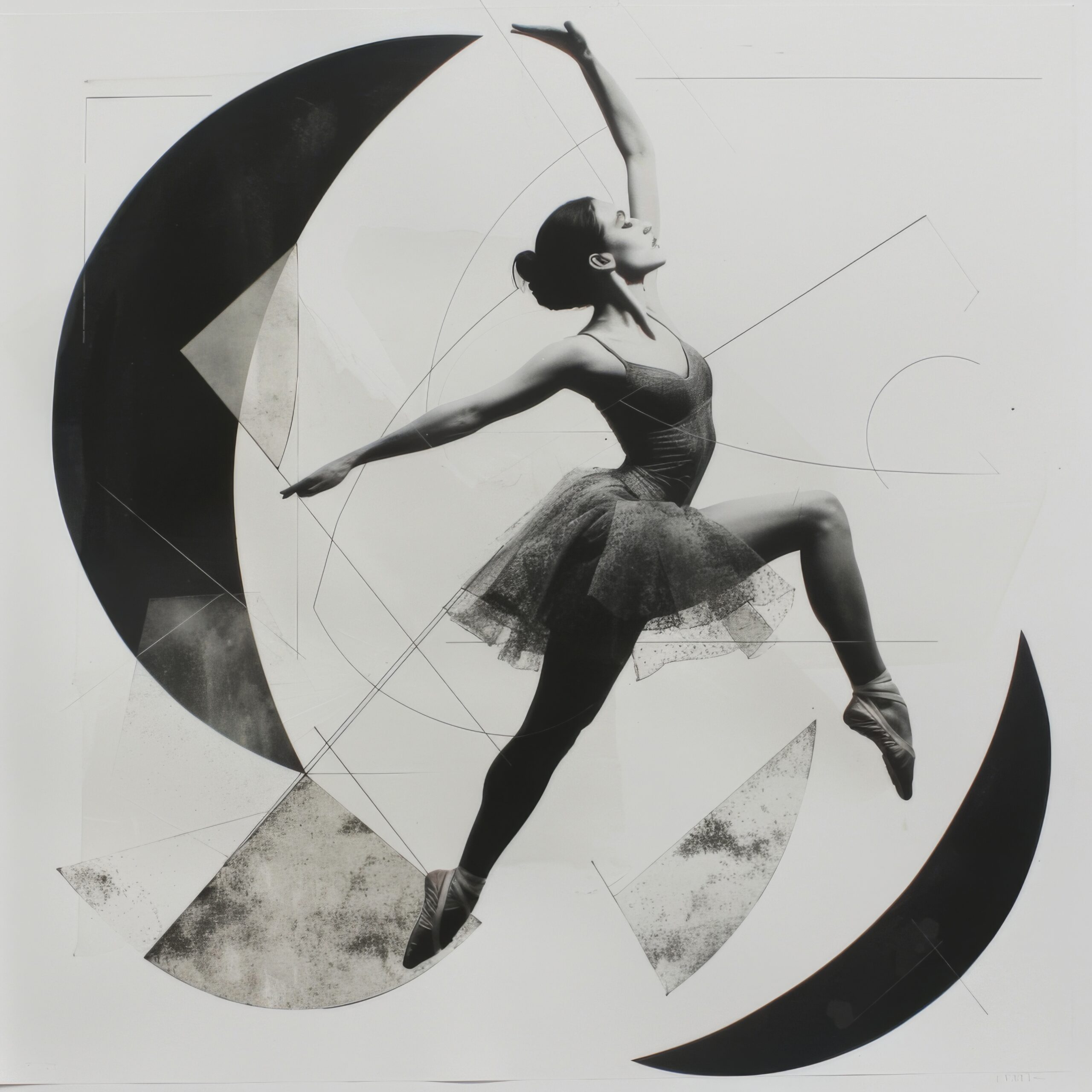 Schwarz Weiß Poster einer Ballerina im Sprung mit geometrischen Formen im Hintergrund, künstlerisch und abstrakt gestaltet