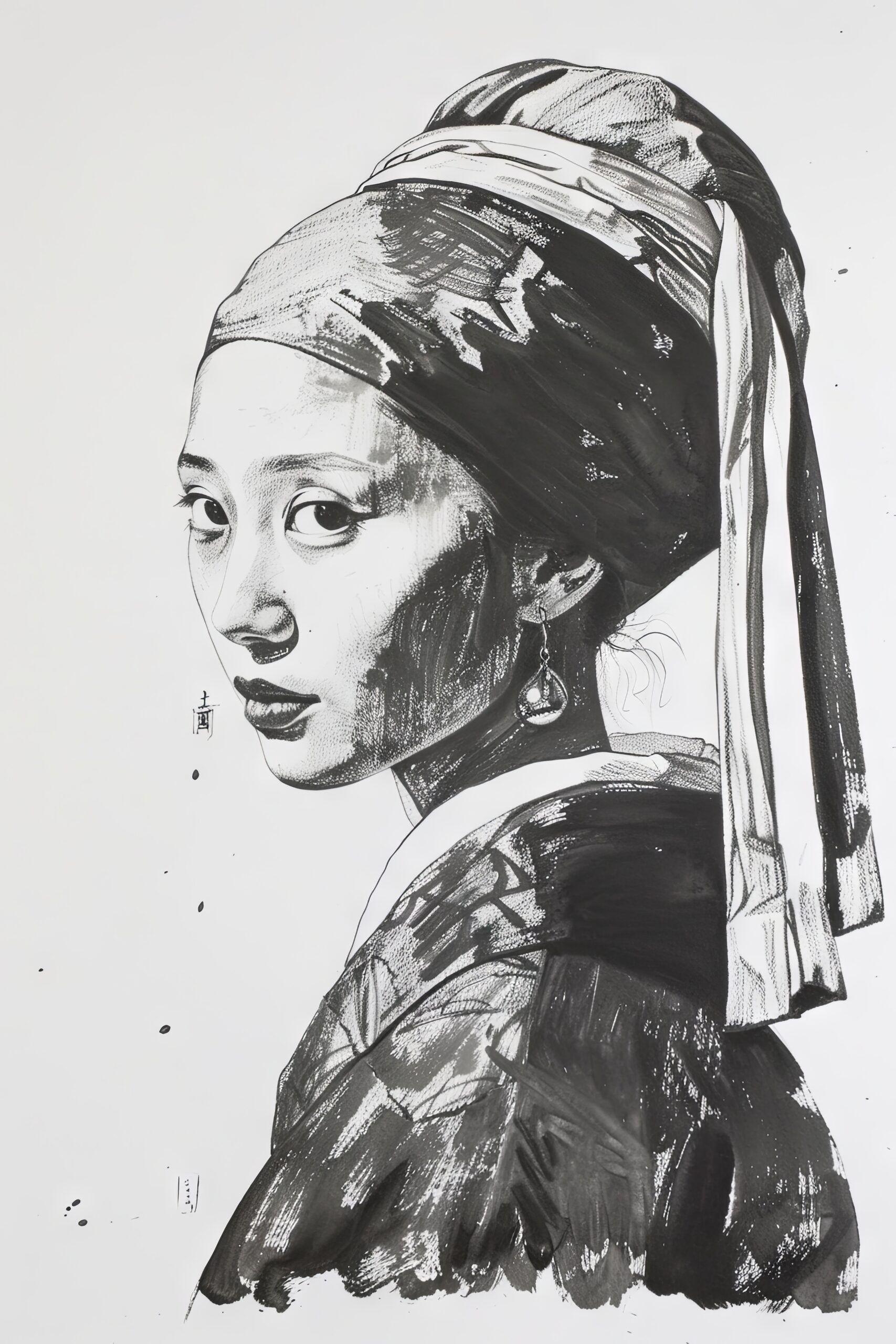 Zeichnung Poster Frau Perlenohrring schwarz-weiß
