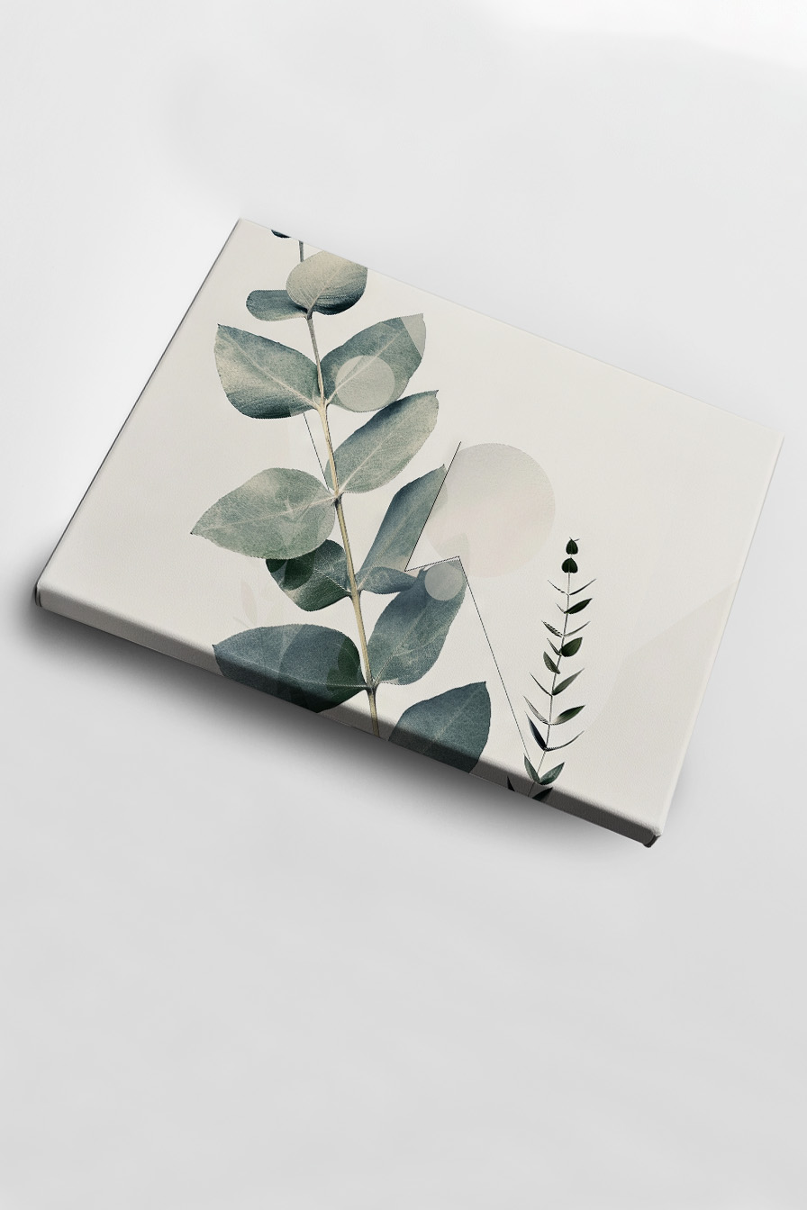 Ein ruhiger Eukalyptuszweig auf Leinwand. Auf Baumwoll-Polyester-Leinwand (300-350 g/m²) auf FSC-zertifiziertem Kiefernholzkeilrahmen gespannt. Das matte Material gibt der Komposition Tiefe. Inklusive Aufhängeset, fertig zum Aufhängen.