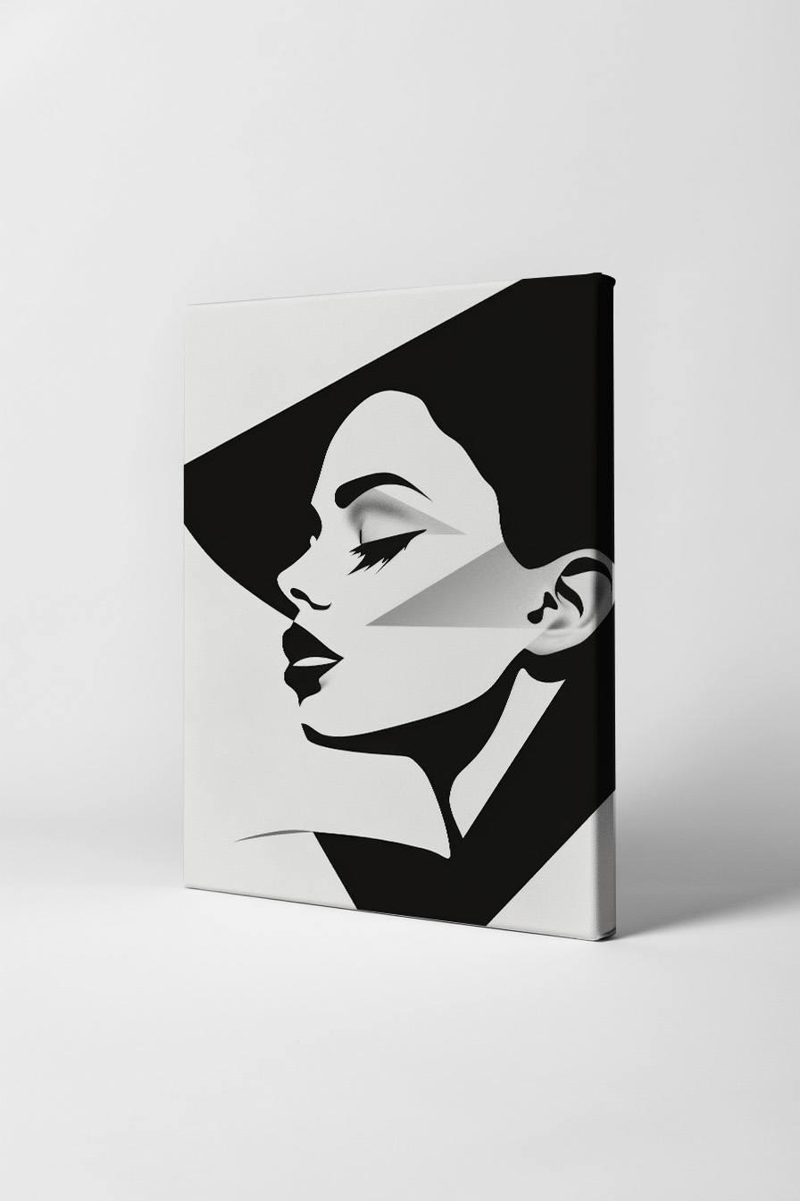 Dieses minimalistische Schwarz-Weiß-Porträt zeigt das Profil einer Frau in klaren Linien. Die reduzierte Gestaltung betont Eleganz und Ruhe.