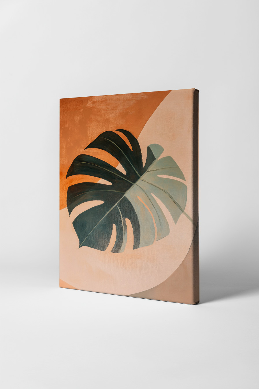 Das Motiv zeigt ein großes Monstera Blatt in gedeckten Farben vor abstraktem Hintergrund. Die warmen Erdtöne schaffen eine ruhige Atmosphäre.