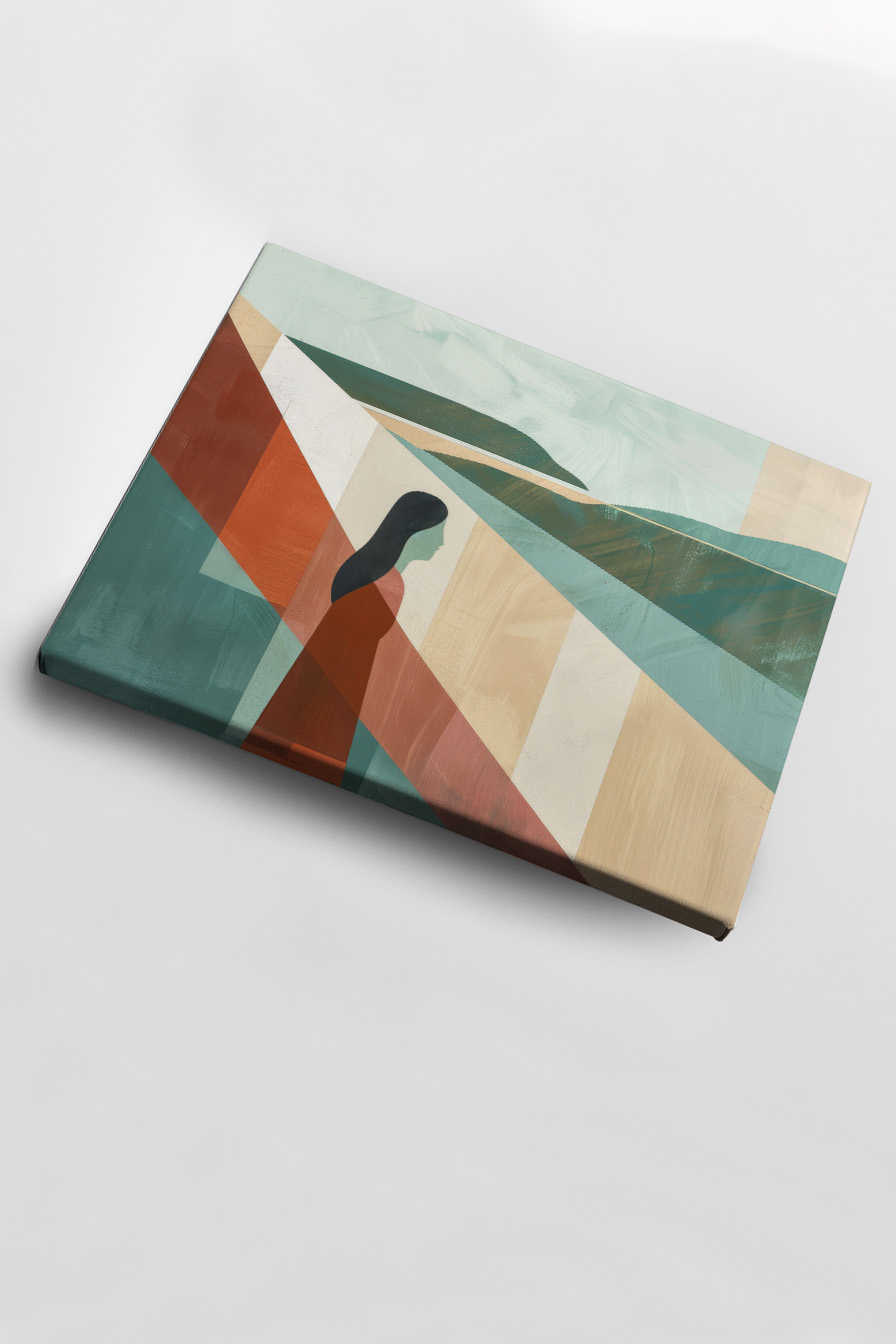 Die Komposition vereint klare Linien und harmonische Farbflächen. Die ruhige Gestalt vor der Weite der Landschaft schafft eine meditative Atmosphäre. Eine reduzierte Szenerie mit Tiefe.