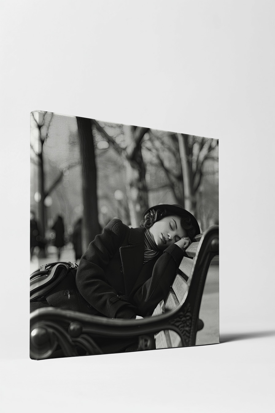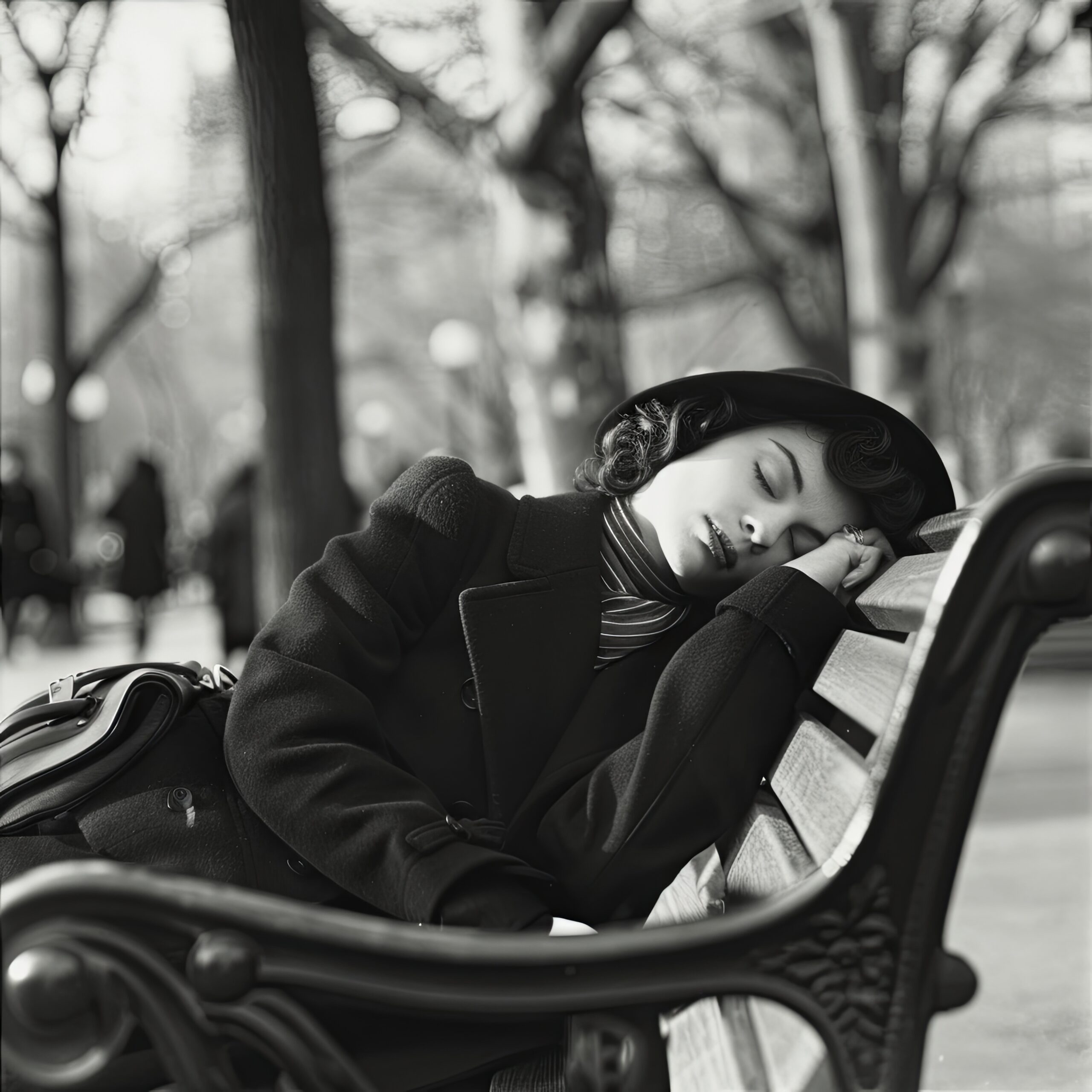 Die Szene zeigt eine ruhige Frau in einem Mantel und Hut, die schlafend an einer Bank lehnt.