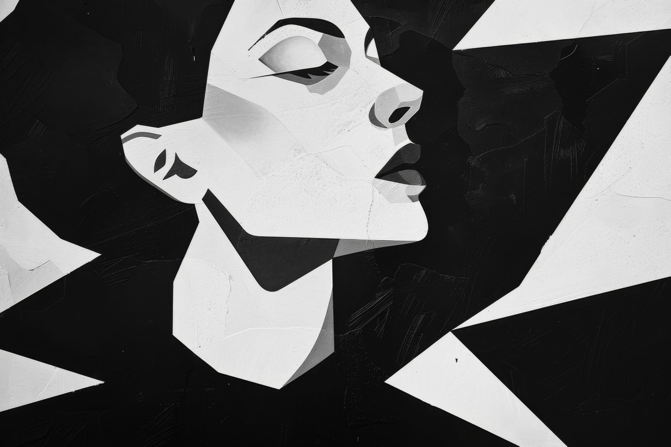 Dieses Bild zeigt ein stilisiertes Frauengesicht in Schwarz-Weiß. Klare Formen und starke Kontraste prägen das Bild.