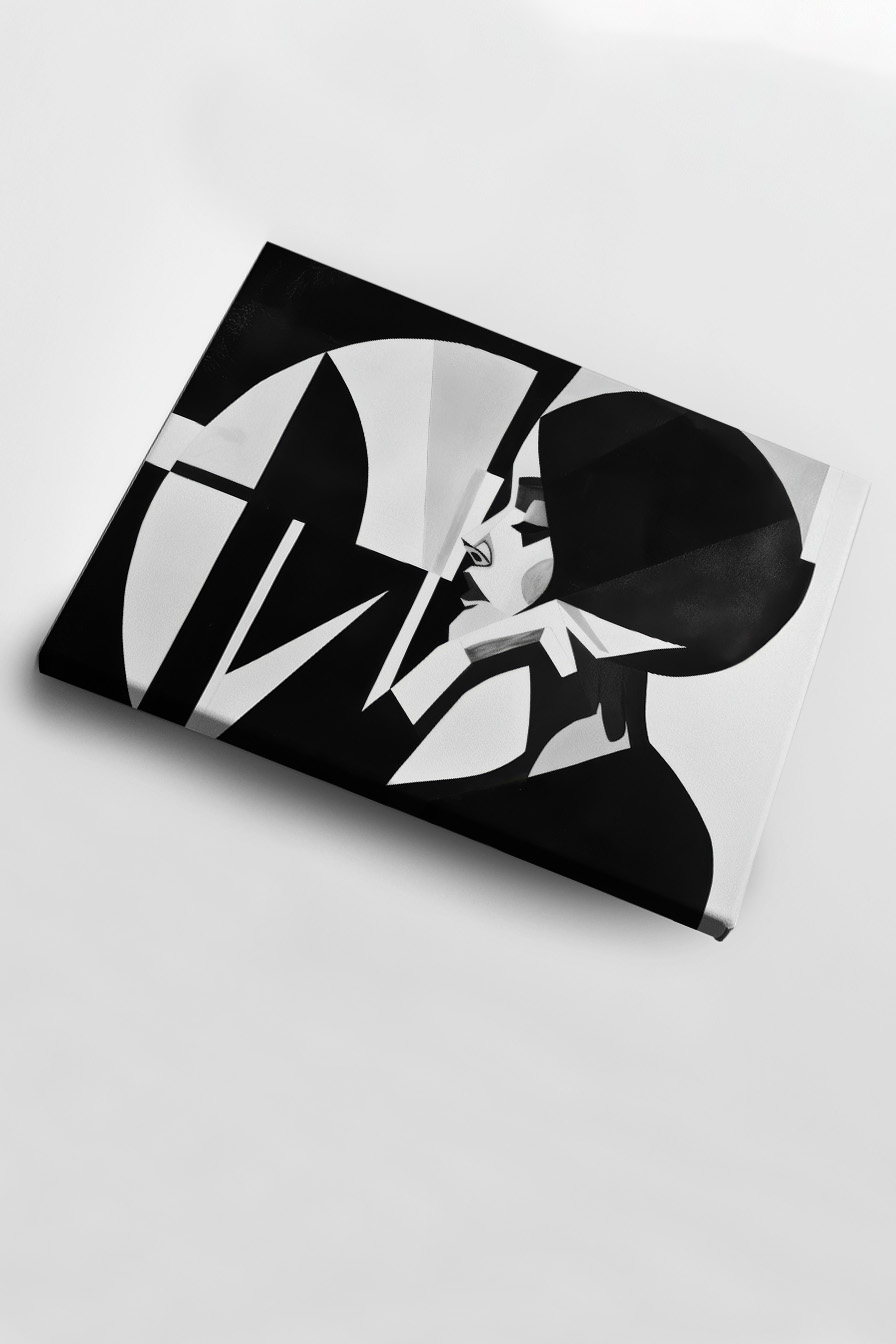 Dieses Bild zeigt ein abstraktes Frauenprofil in Schwarz-Weiß mit klaren Linien und geometrischen Formen. Die Komposition wirkt modern und reduziert.