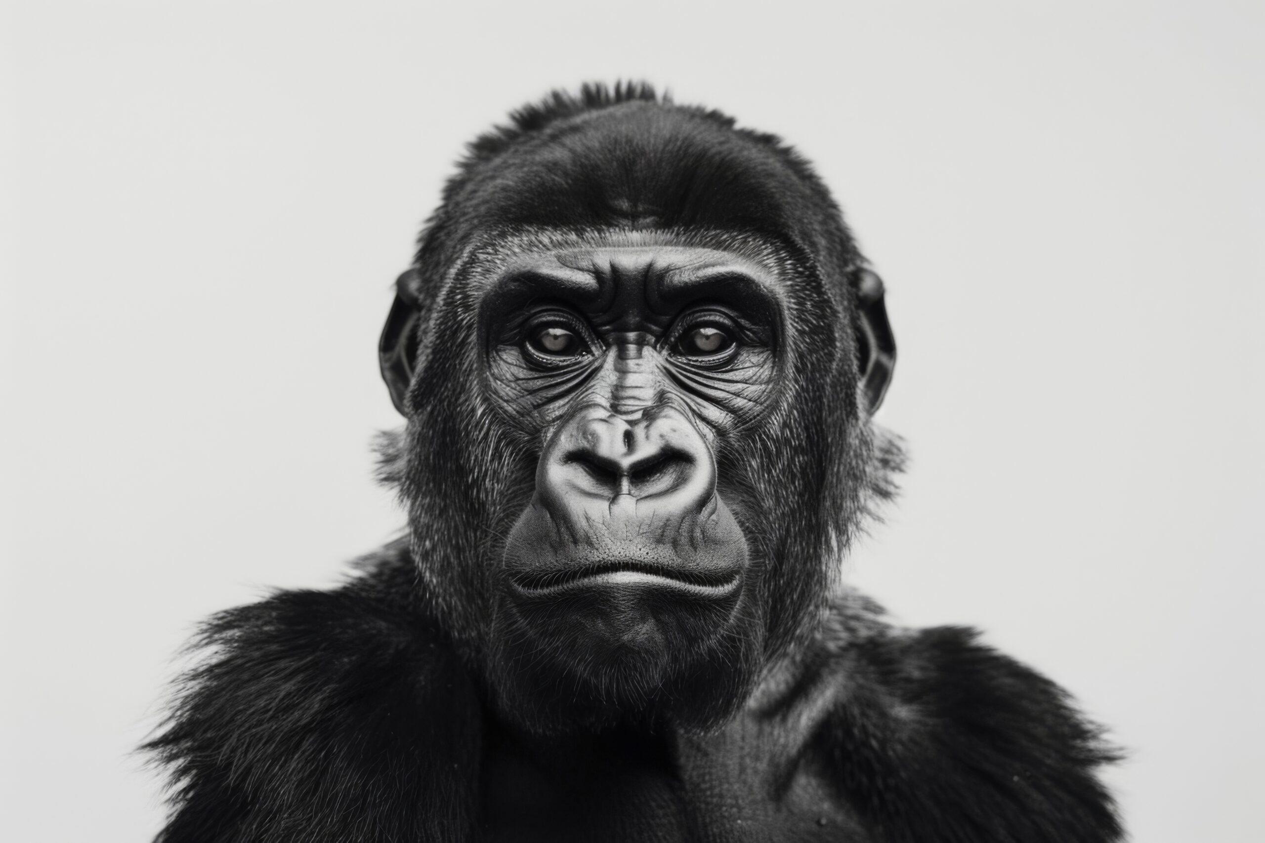 Ein kraftvolles Tier in seiner vollen Präsenz, dargestellt in minimalistischer Schwarz-Weiß-Ästhetik. Die klare Linienführung fokussiert auf die markanten Gesichtszüge und das dichte Fell. Das Bild strahlt Ruhe und Stärke aus.