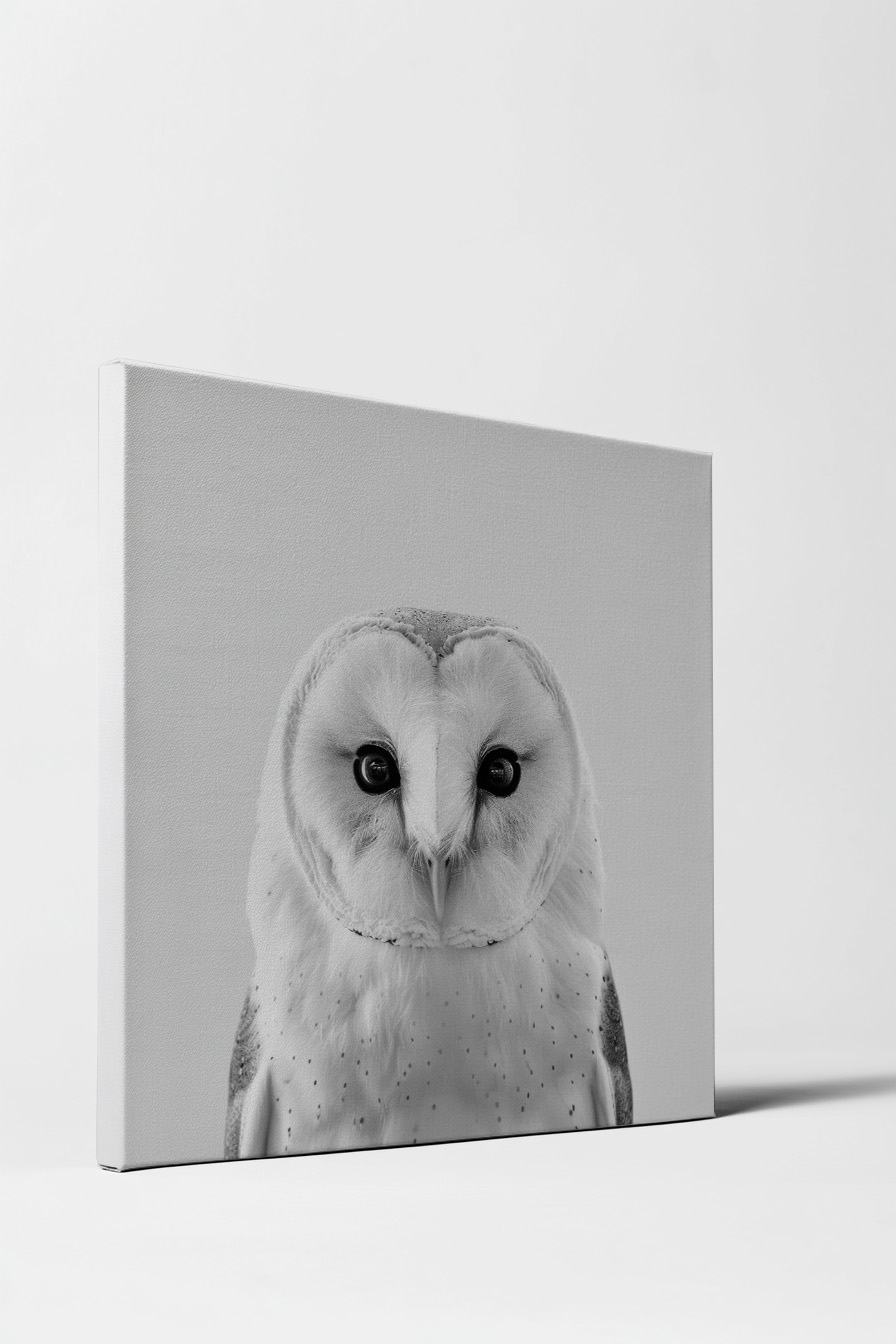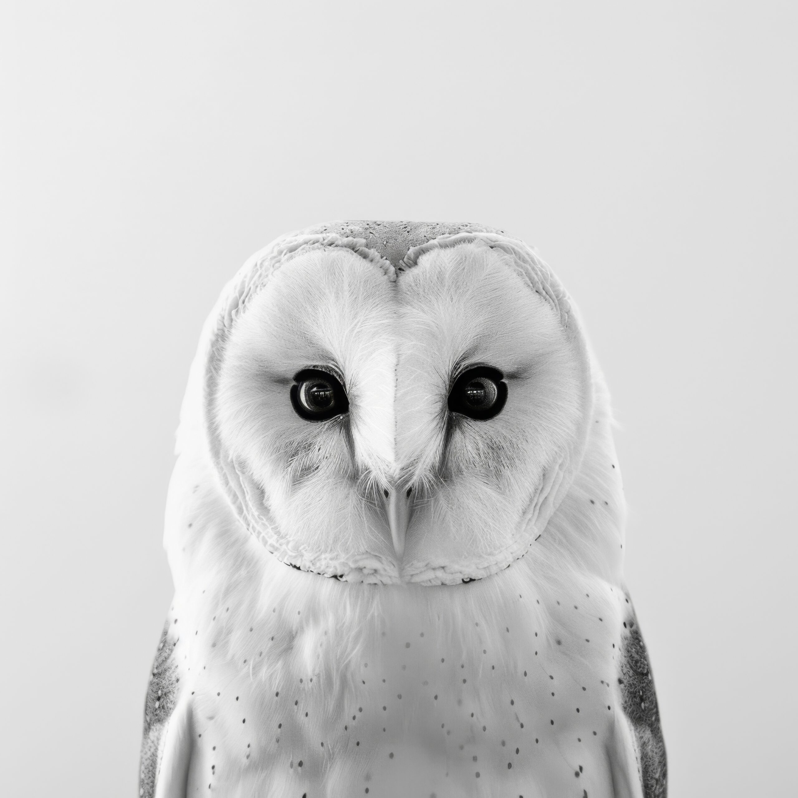 Die Schleiereule zeigt ihr markantes Gesicht mit zarten Details, die im Schwarz-Weiß besonders klar wirken. Die ruhige Ausstrahlung und die kontrastreichen Schatten verstärken die Präsenz des Vogels im Bild. Das Bild wirkt dabei zeitlos und fokussiert.