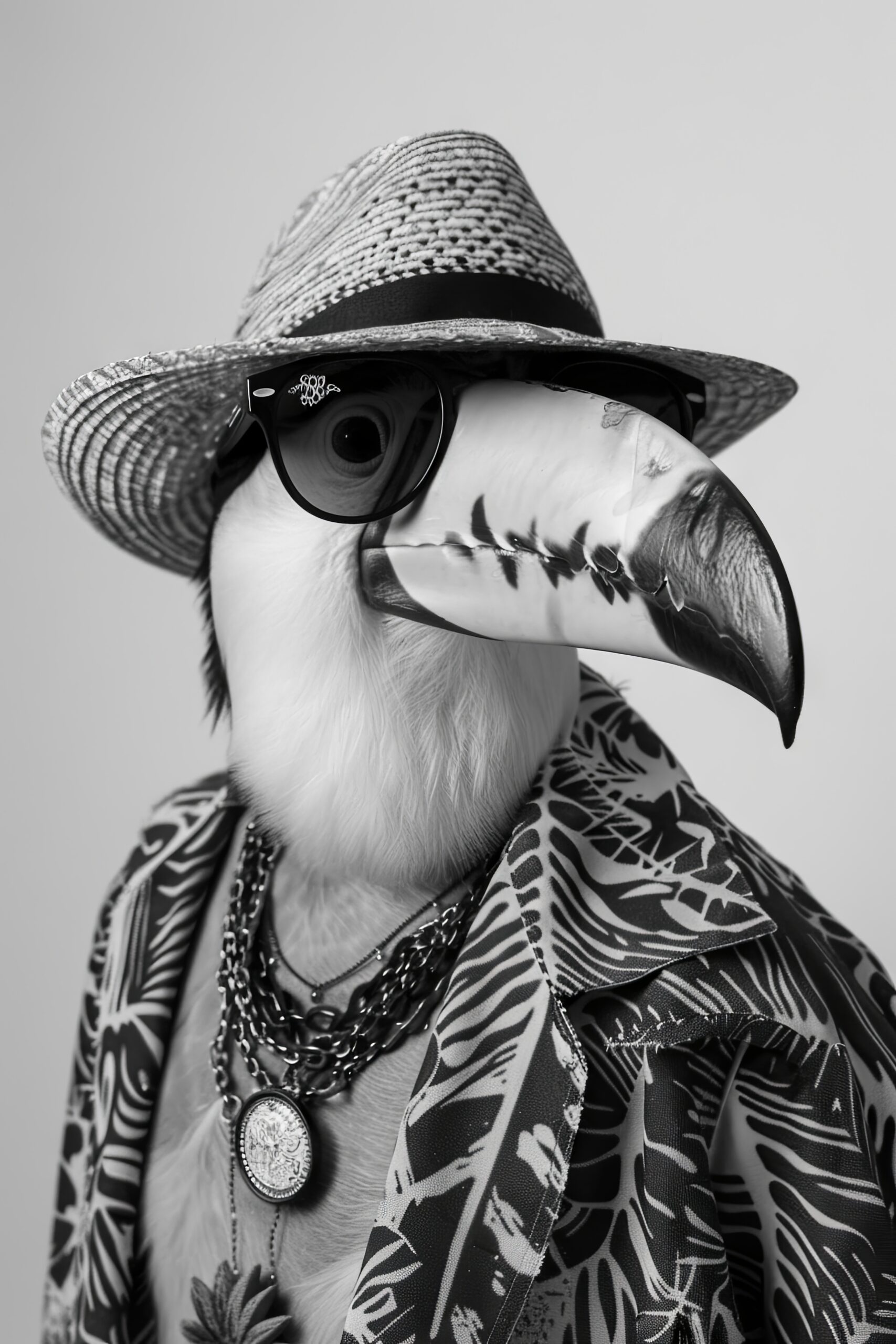Ein Tukan mit Sonnenhut und gemustertem Hemd in Schwarz-Weiß. Gedruckt auf Baumwoll-Polyester-Leinwand (300-350 g/m²) und auf FSC-zertifiziertem Kiefernholzkeilrahmen gespannt. Inklusive Aufhängeset, fertig zum Hängen.