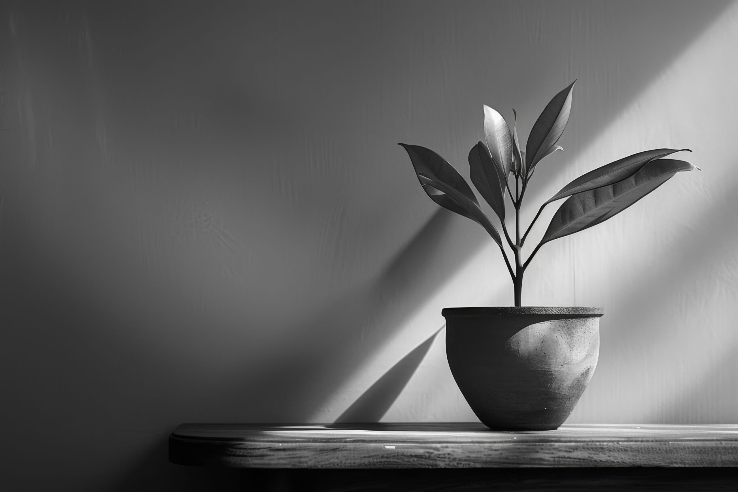 Das Zusammenspiel aus Licht und Schatten formt eine ruhige, fast meditative Szene. Die Pflanze steht im Mittelpunkt und hebt sich durch die gezielte Beleuchtung dramatisch ab. Ein Moment der Stille, eingefangen im Raum.
