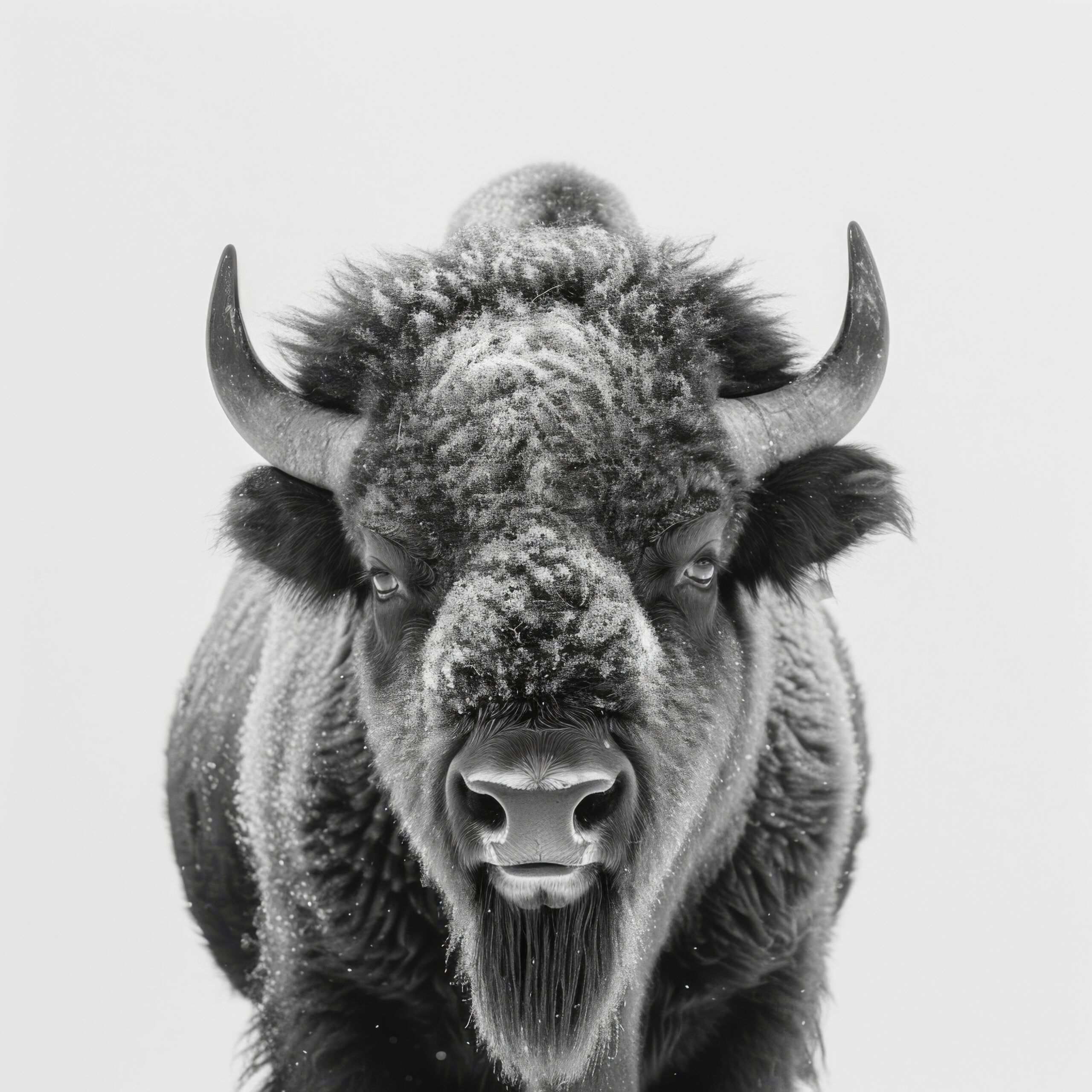 Dieses Schwarz-Weiß-Bild zeigt einen Bison im Schnee aus der Nahaufnahme. Das Fell des Bisons ist deutlich mit Schneekristallen bedeckt.
