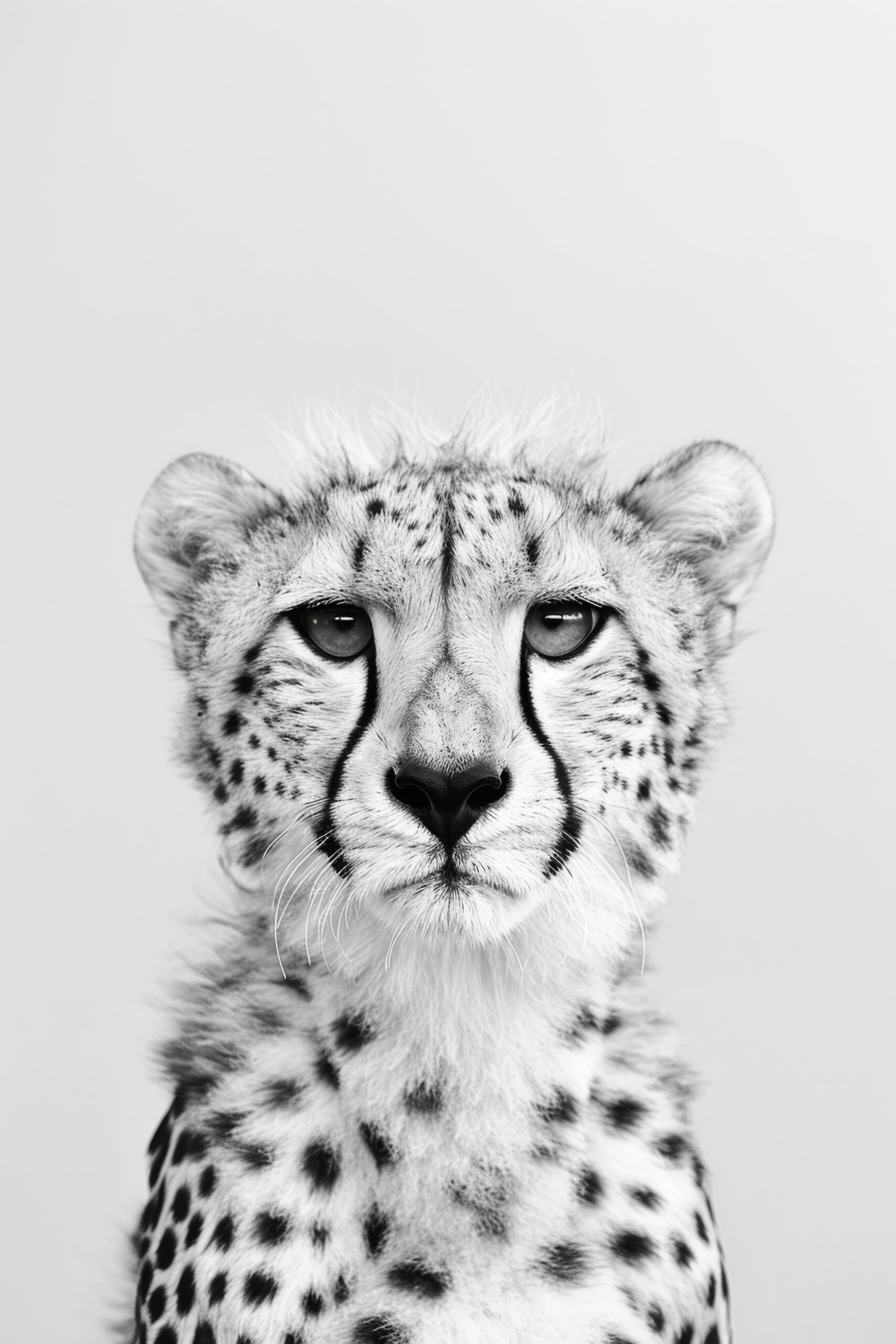 Eine intensive Aufnahme, deren Schlichtheit und Klarheit das wild-gezügelte Wesen des Gepards betont. Keine Ablenkungen, nur das klare Porträt mit feinen Details, das die Kraft und Eleganz der Raubkatze einfängt. Fein gearbeitete Struktur im Fell lädt zum Verweilen ein.