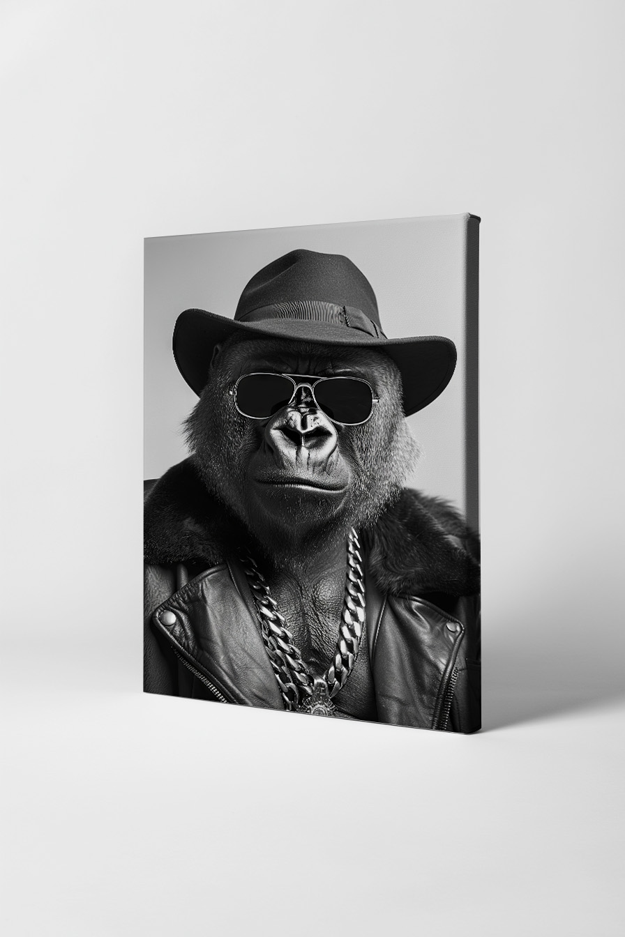 Ein Gorilla mit Hut und Sonnenbrille. Auf Baumwoll-Polyester-Leinwand 300-350 g/m² auf FSC-zertifiziertem Kiefernholzkeilrahmen gespannt. Fertig zum Aufhängen inklusive Aufhängeset.