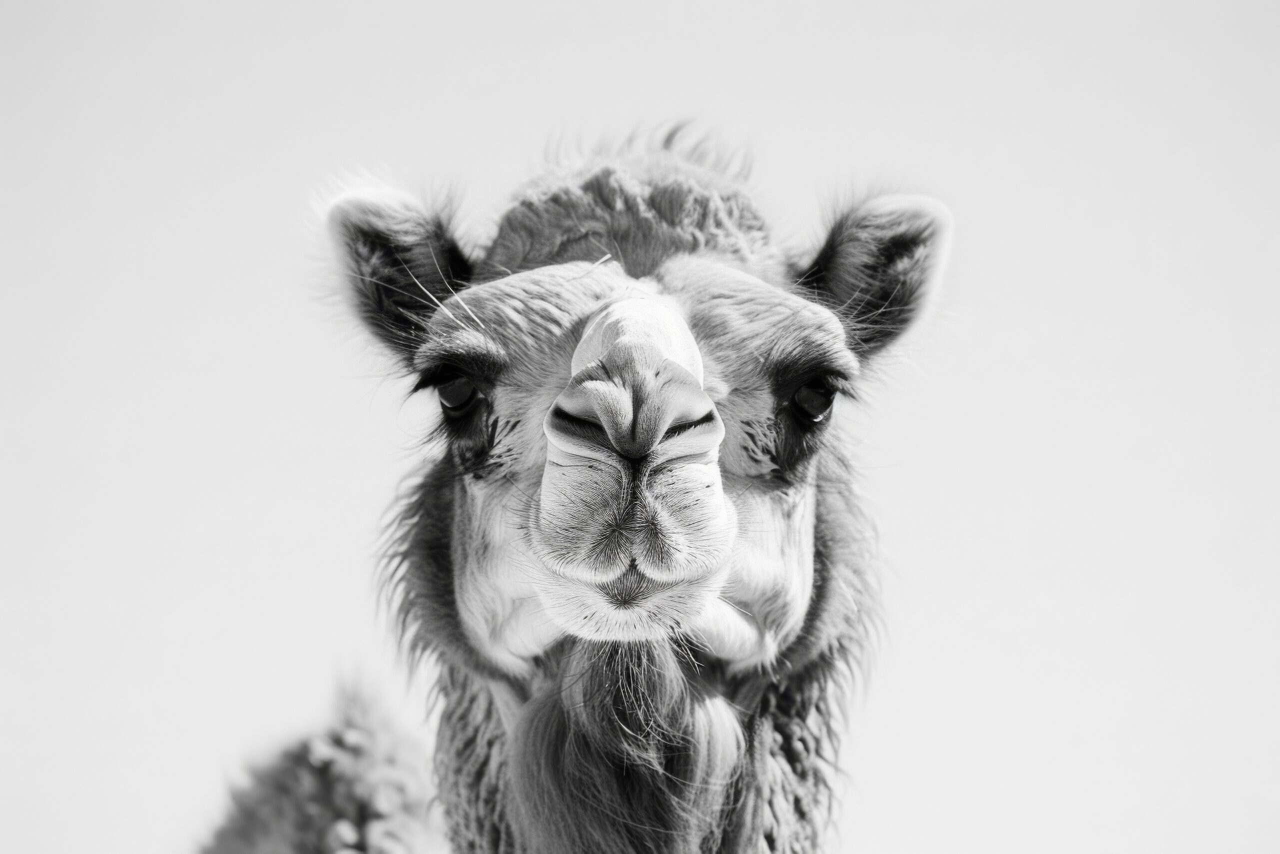 Das Kamel frontal in Schwarz-Weiß mit Fokus auf Mimik und Fellstruktur.