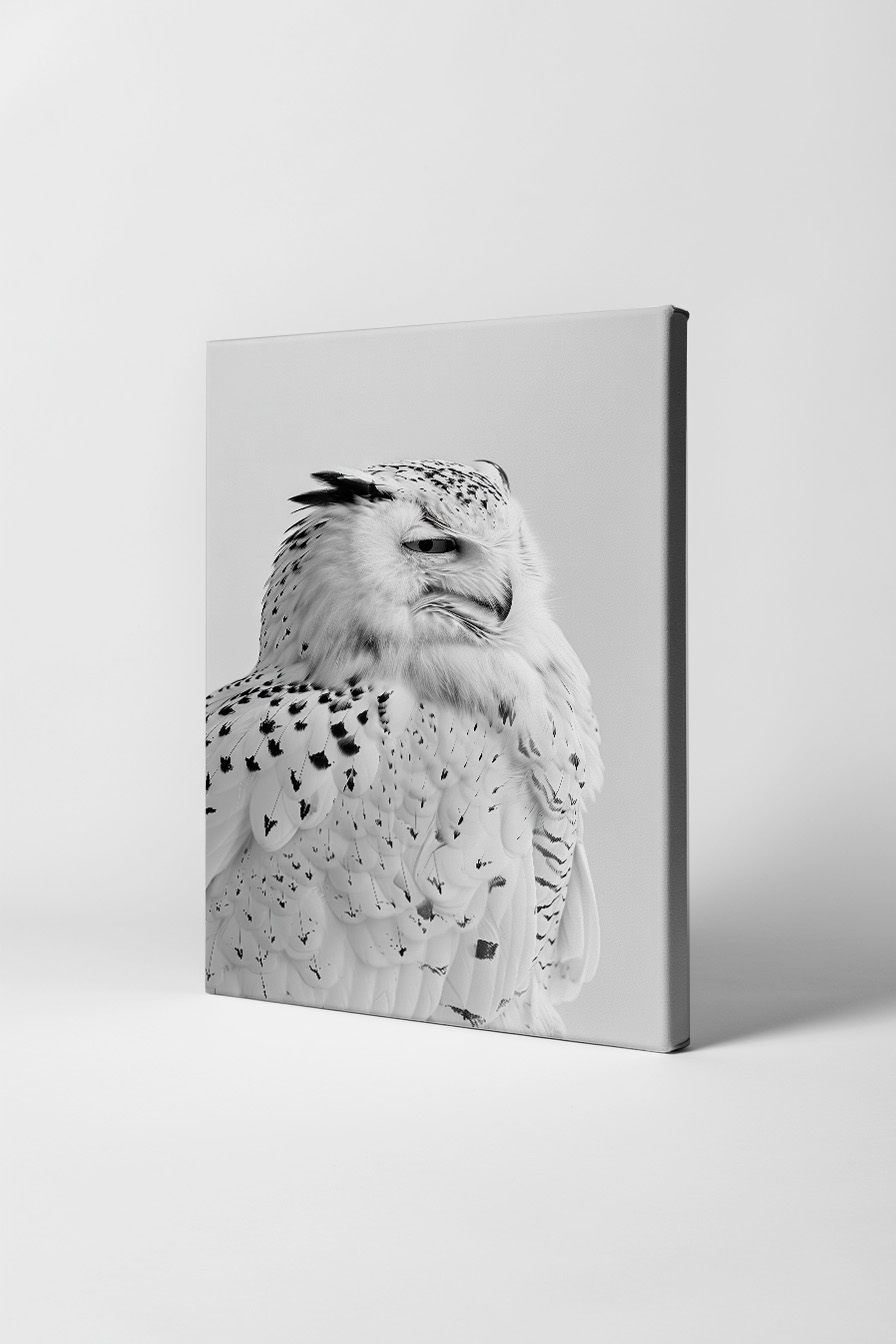 Fein ausgearbeitete Nahaufnahme einer Schnee-Eule im Profil. Das Bild besticht durch klare Details und monochrome Farben.