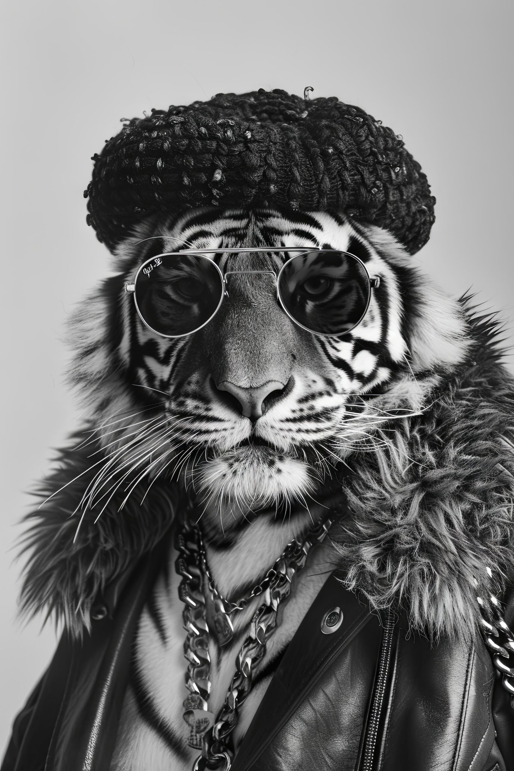 Fotografie Poster Tiger Portrait schwarz-weiß Mütze Sonnenbrille