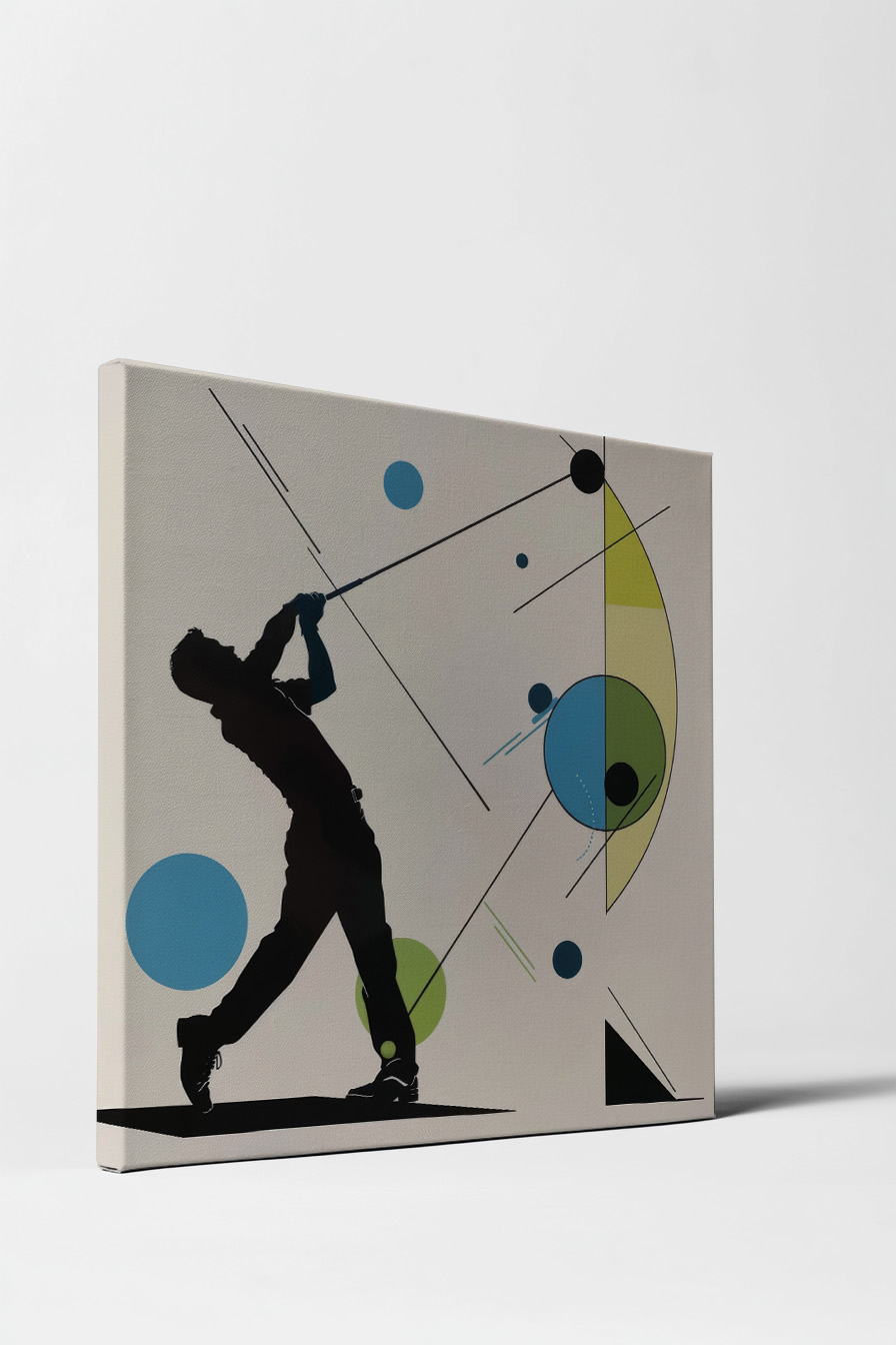 Das Zusammenspiel von Schatten und Farbe erzeugt einen ruhigen Rhythmus. Die Kreise in Blau und Grün tanzen um den Golfer herum, die feinen Linien verbinden die Formen zu einem stimmigen Gesamtbild. Eine Komposition, die Bewegung und Klarheit vereint.