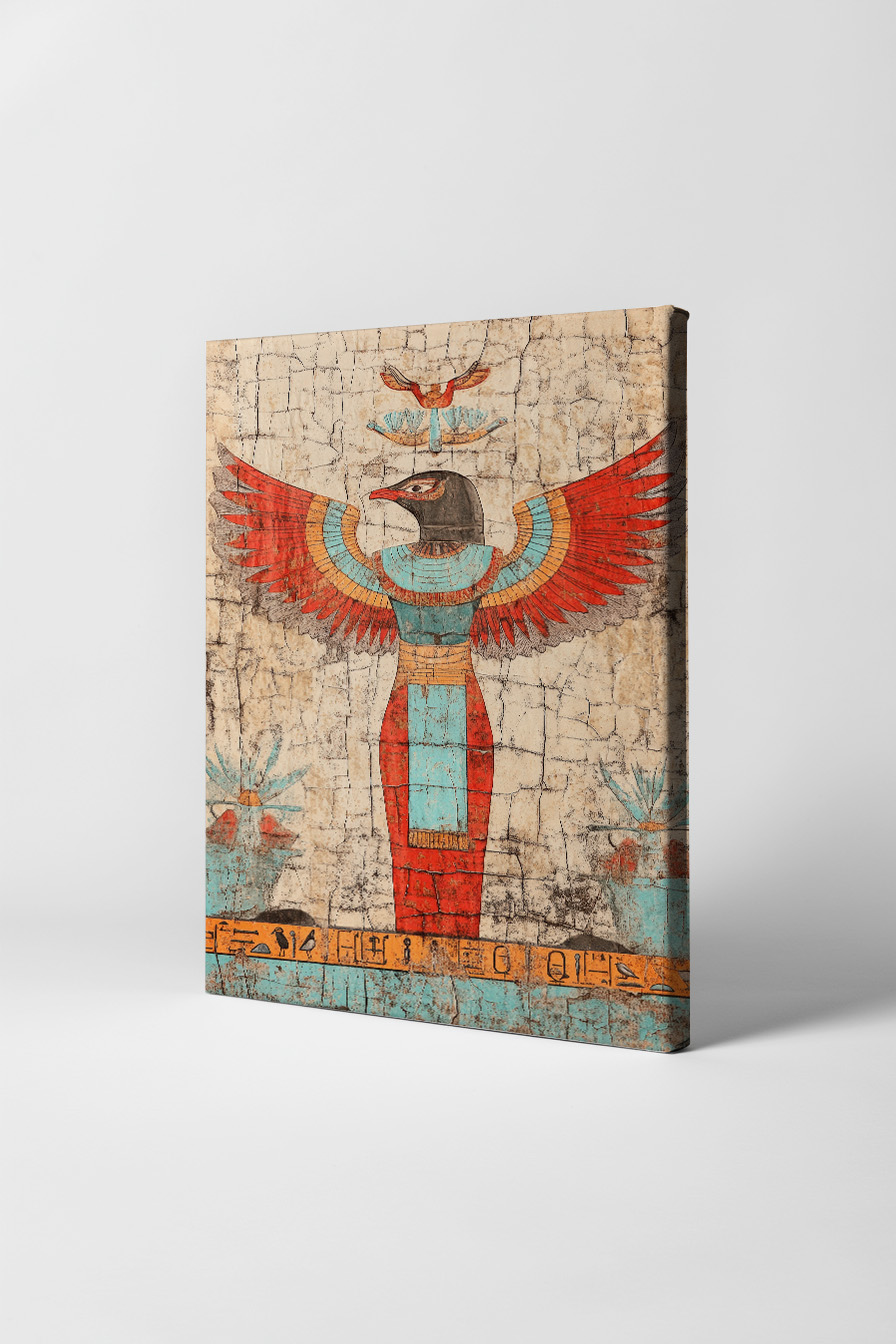 Diese detailreiche Wandmalerei zeigt eine ägyptische Gottheit mit Falkenkopf und ausgebreiteten Flügeln in kräftigen Farben. Die alte Hieroglyphenzeile unterstreicht das historische Motiv.