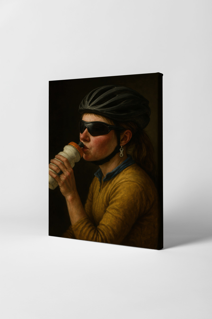 Eine Radfahrerin porträtiert mit natürlicher Haltung. Die Leinwand aus Baumwoll-Polyester ist auf FSC-zertifiziertem Kiefernholzkeilrahmen gespannt. Lieferung fertig zum Aufhängen inklusive Set.