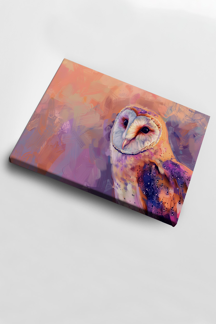 Das ruhige Porträt der Schleiereule spannt sich auf Baumwoll-Polyester-Leinwand (300-350 g/m²) auf FSC-zertifiziertem Holzrahmen. Fertig zum Aufhängen mit dabeiem Set.