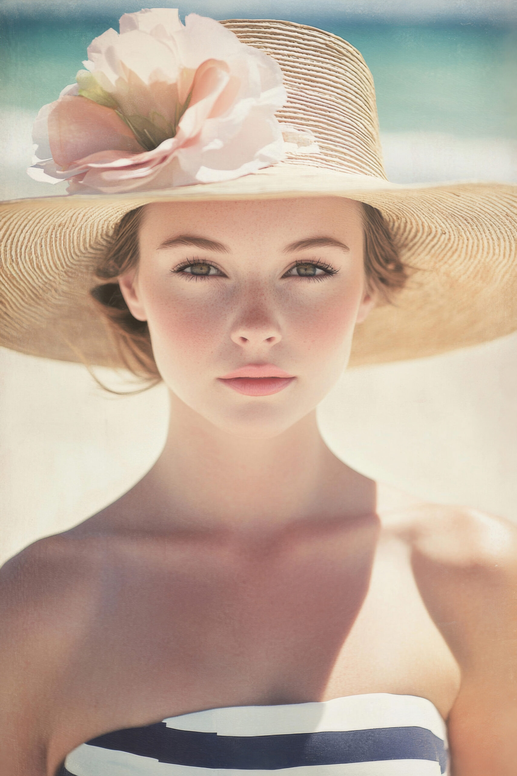 Porträt einer jungen Frau mit großem Strohhut und zarter Blume. Das Bild vermittelt eine sommerliche, leichte Atmosphäre.