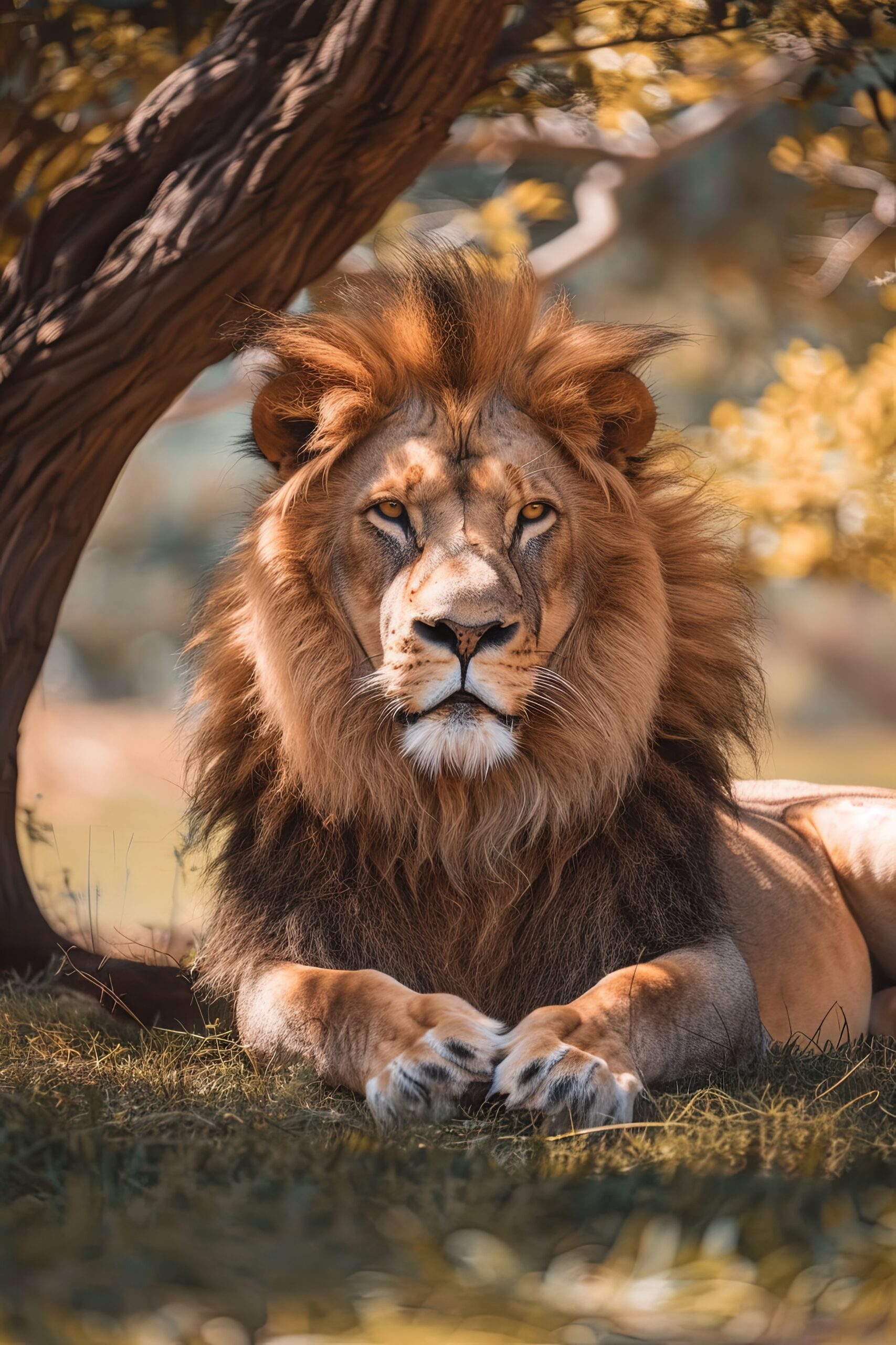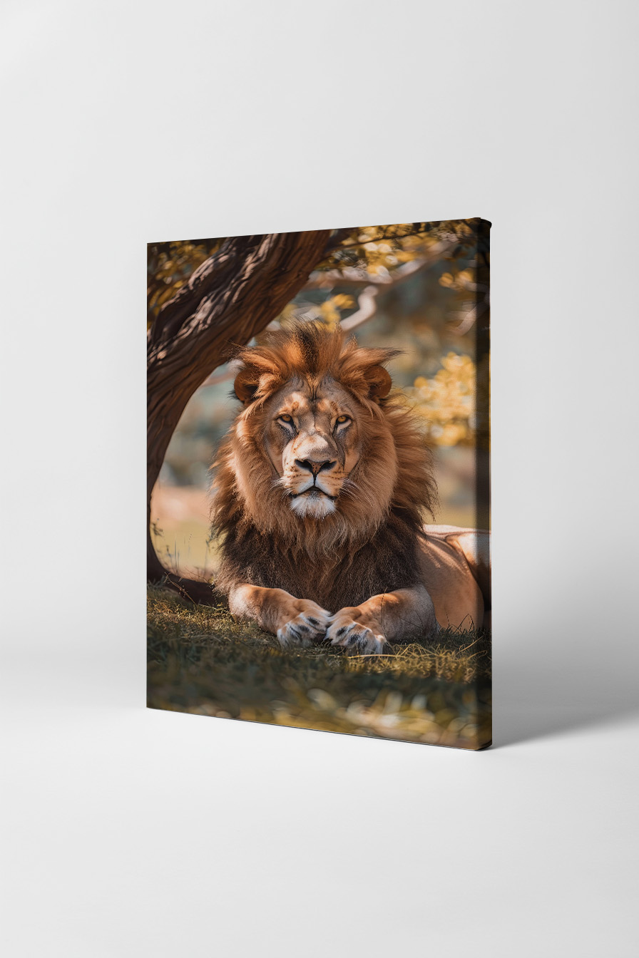 Ein entspannter Löwe, ruhig positioniert unter einem Baum. Auf Baumwoll-Polyester-Leinwand (300-350 g/m²) gespannt auf FSC-zertifiziertem Kiefernholzkeilrahmen. Inklusive Aufhängeset, fertig zum Aufhängen.
