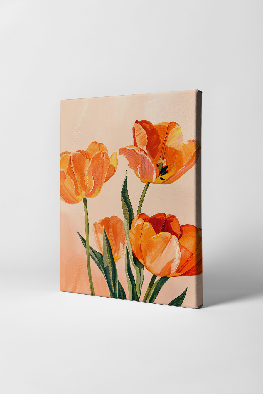 Ein Ensemble aus Tulpen sticht hervor, jeder Stängel mit eigenem Schwung. Die Farbnuancen bewegen sich zwischen hellem Apricot und tiefem Orange, das Licht unterstreicht die Texturen auf den Blüten.