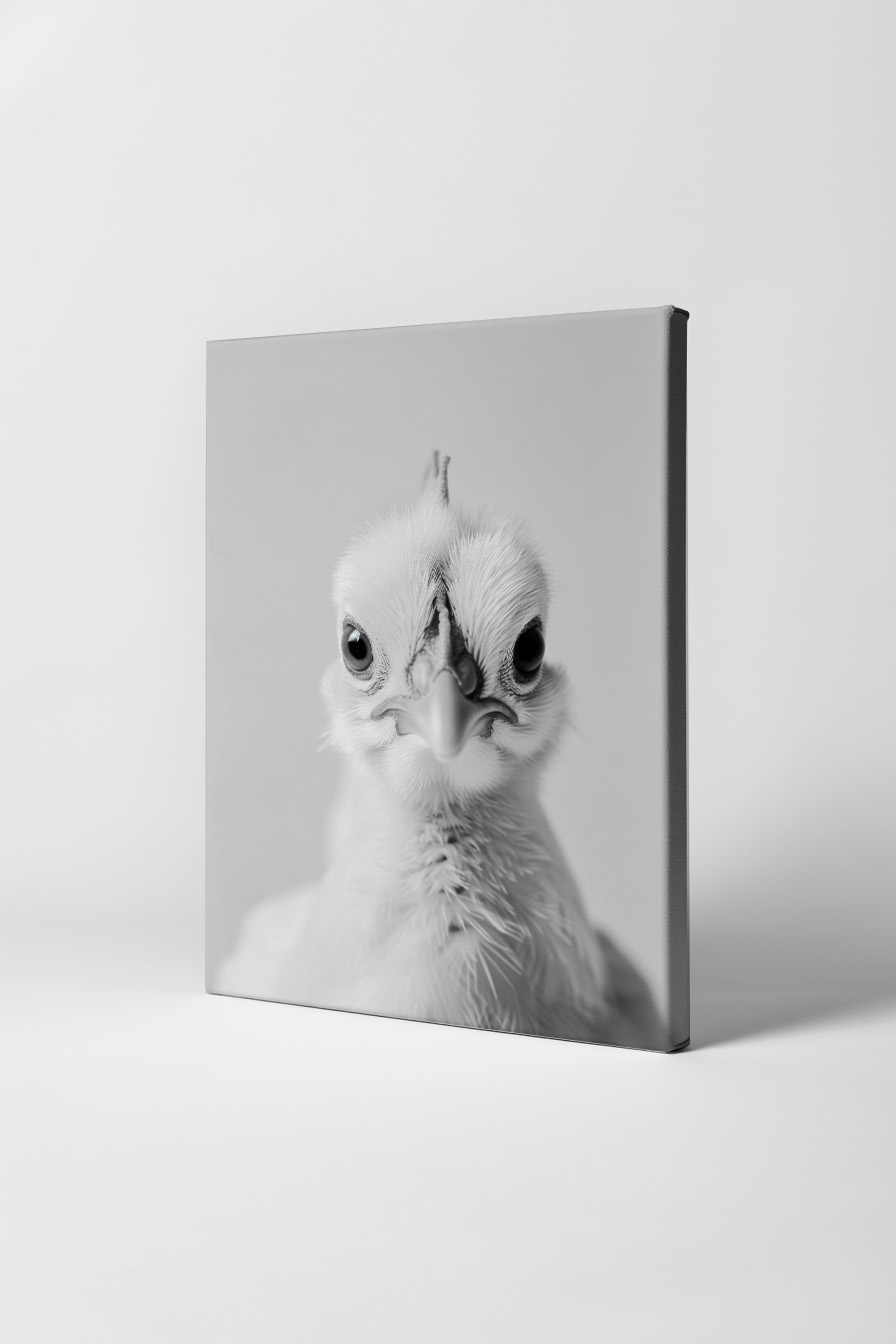 Ein klarer Fokus auf die intensiven Augen erzeugt eine starke Präsenz im Raum. Die subtilen Graustufen verleihen dem Motiv Tiefe und Charakter.
