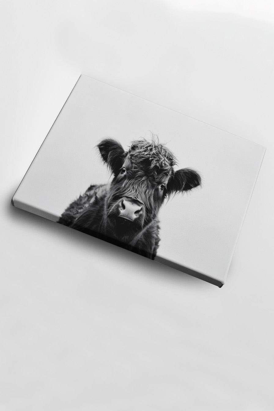 Das Kalb wirkt mit seinem unruhigen Fell lebendig und präsent. Man kann die sanfte Textur fast fühlen und die ruhigen Augen ziehen in ihren Bann.